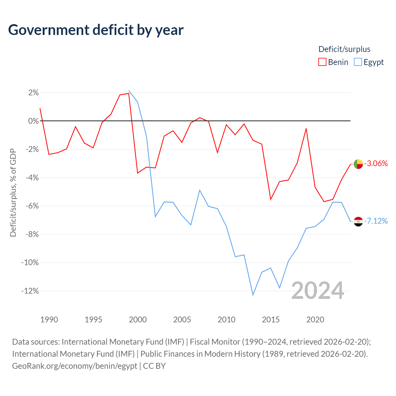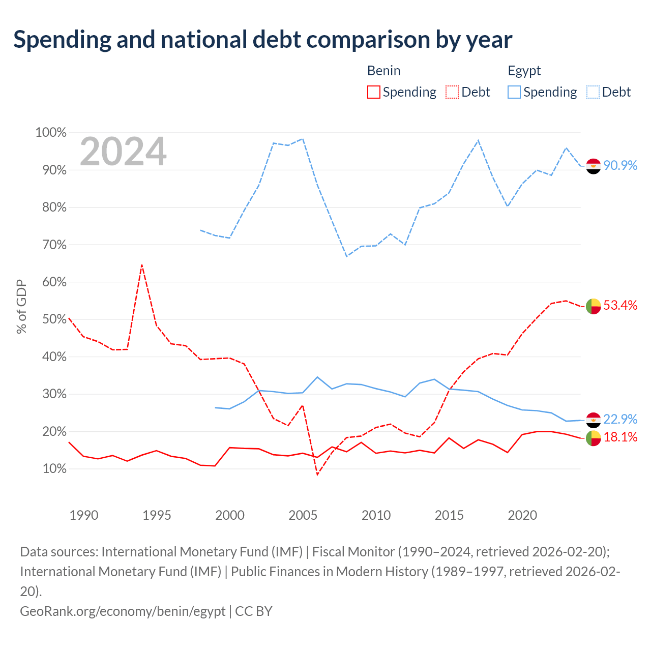 Benin has $11.5B in government debt (53.4% of GDP), compared to $354B (90.9% of GDP) in Egypt.