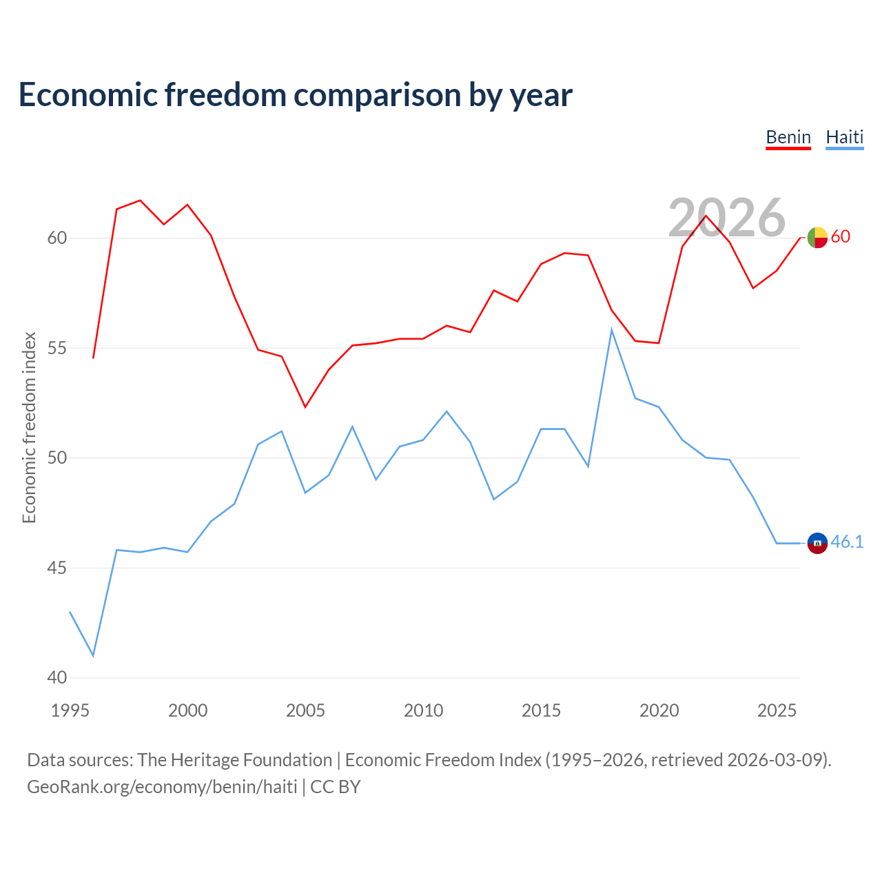 The Economic Freedom Index for Benin is 60, ranking 96/197, compared to 46.1 for Haiti, ranking 178/197. The chart above displays a comparison of annual changes in economic freedom indexes.