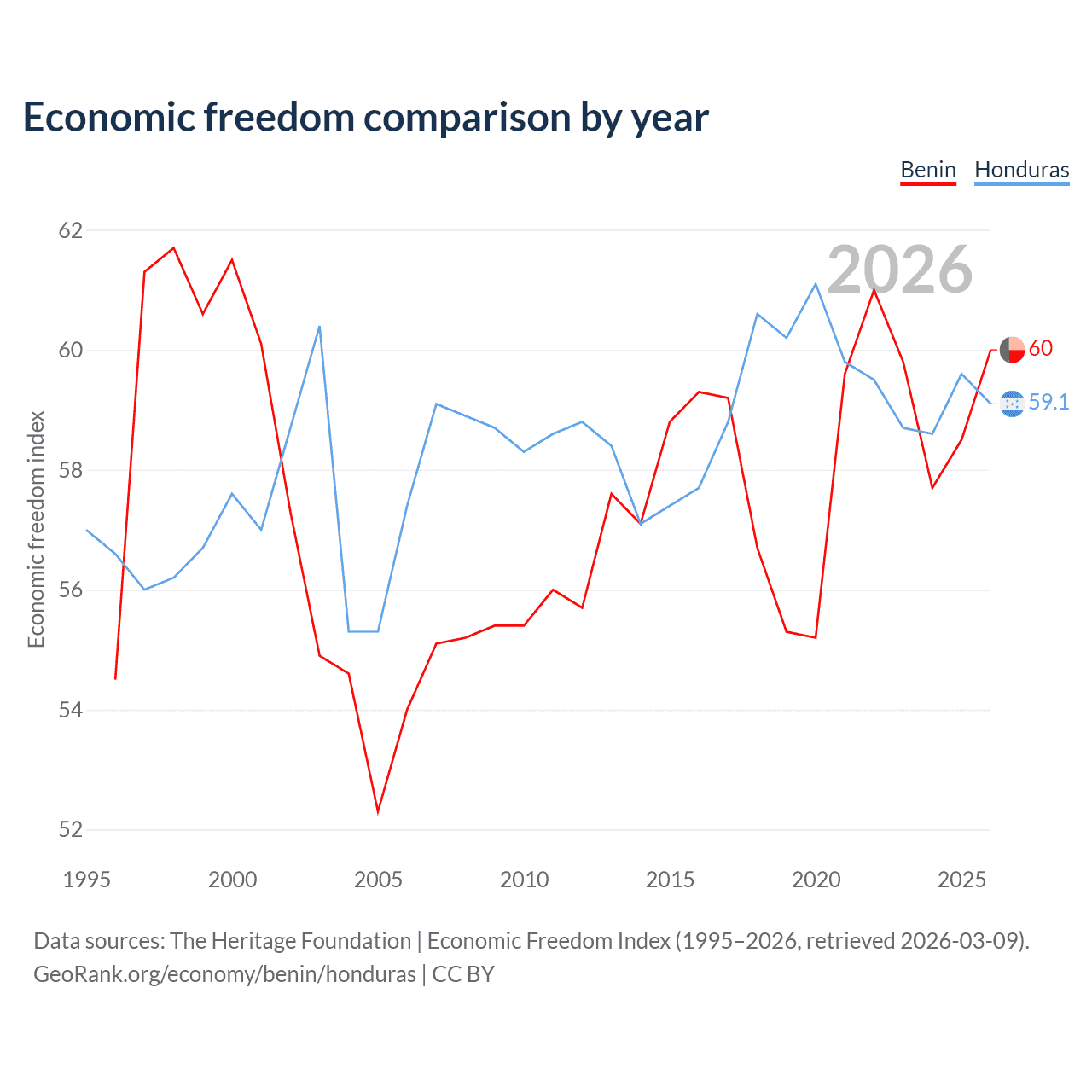 The Economic Freedom Index for Benin is 60, ranking 96/197, compared to 59.1 for Honduras, ranking 105/197. The chart above displays a comparison of annual changes in economic freedom indexes.