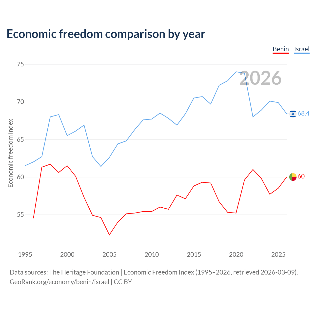 The Economic Freedom Index for Benin is 60, ranking 96/197, compared to 68.4 for Israel, ranking 47/197. The chart above displays a comparison of annual changes in economic freedom indexes.
