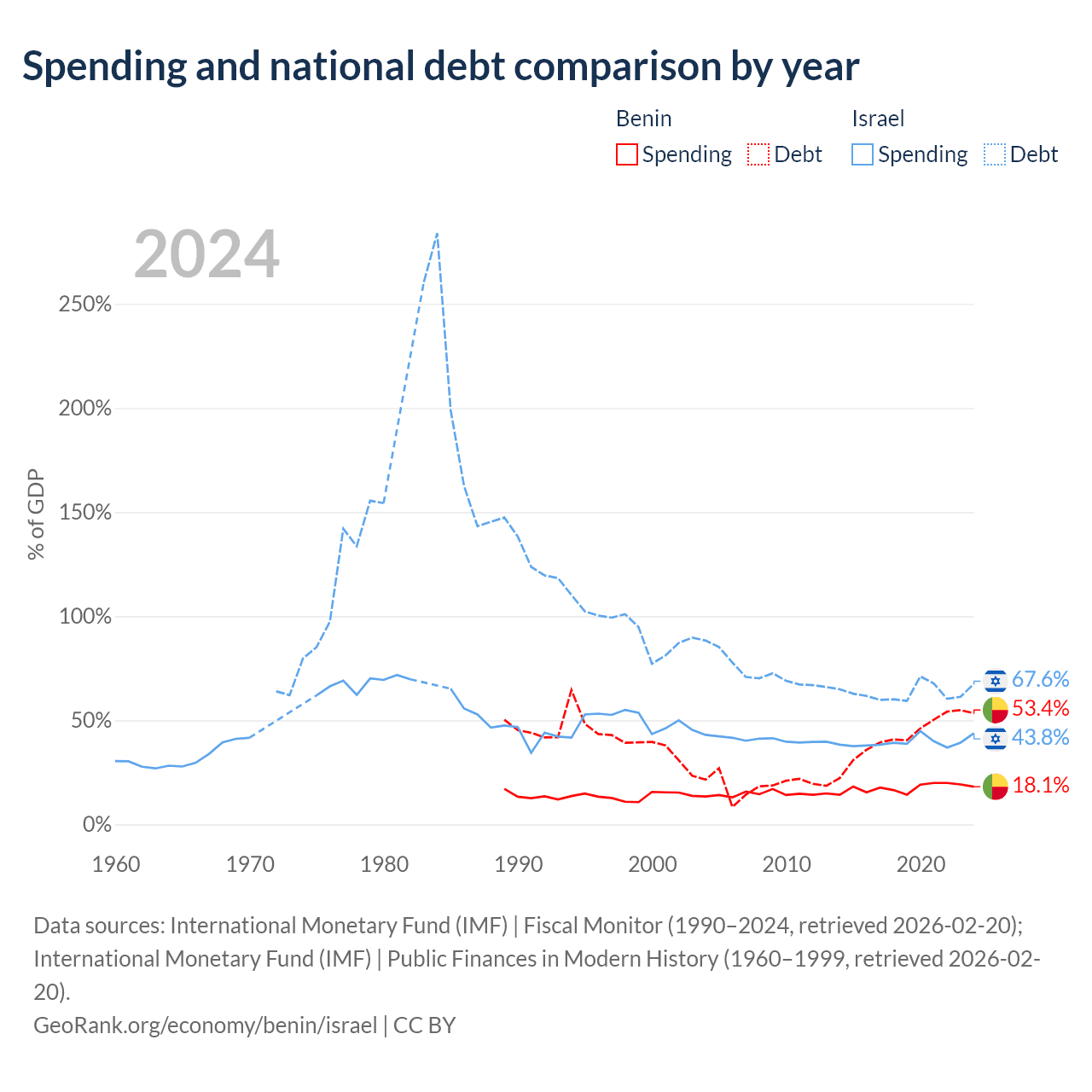 Benin has $11.5B in government debt (53.4% of GDP), compared to $366B (67.6% of GDP) in Israel.