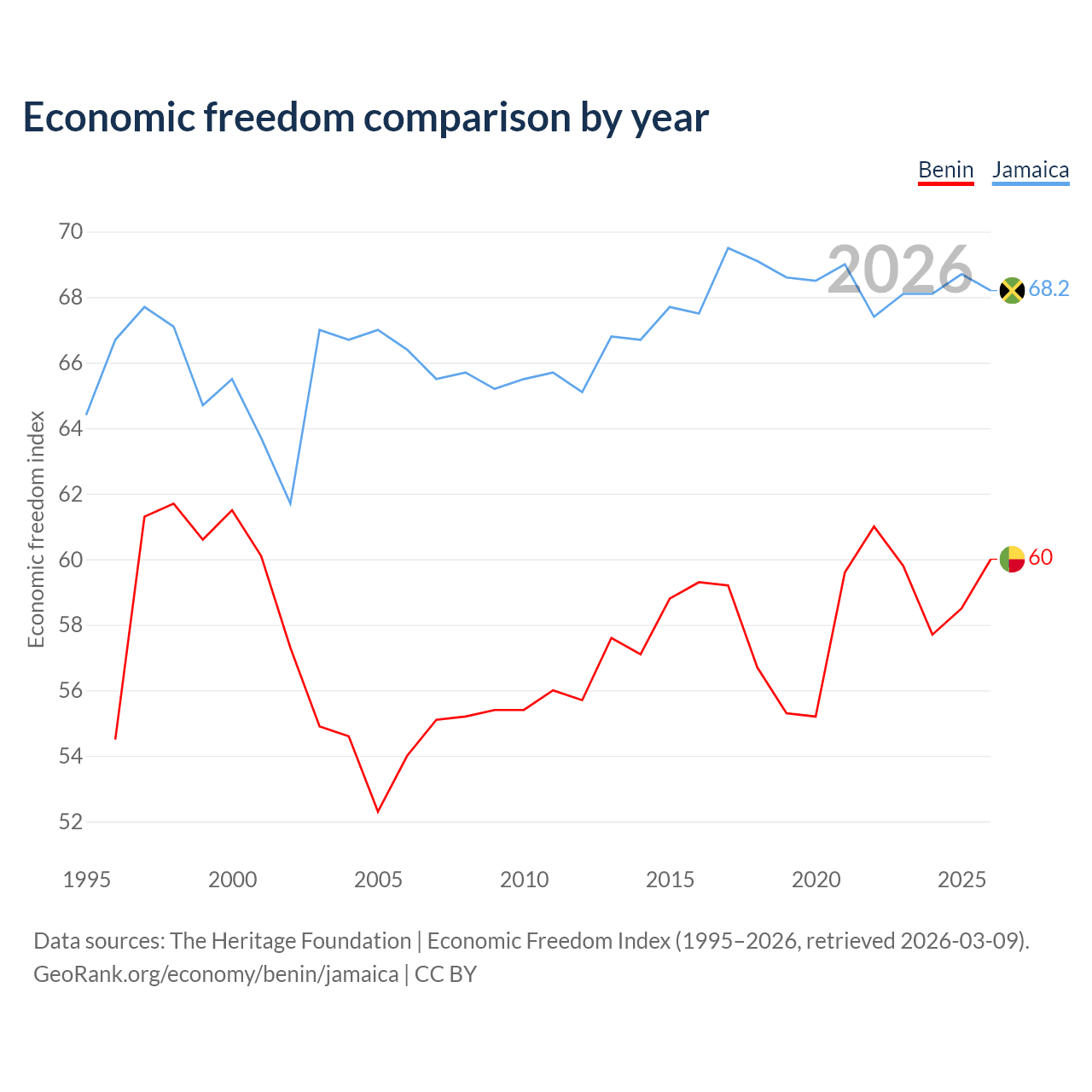 The Economic Freedom Index for Benin is 60, ranking 96/197, compared to 68.2 for Jamaica, ranking 48/197. The chart above displays a comparison of annual changes in economic freedom indexes.