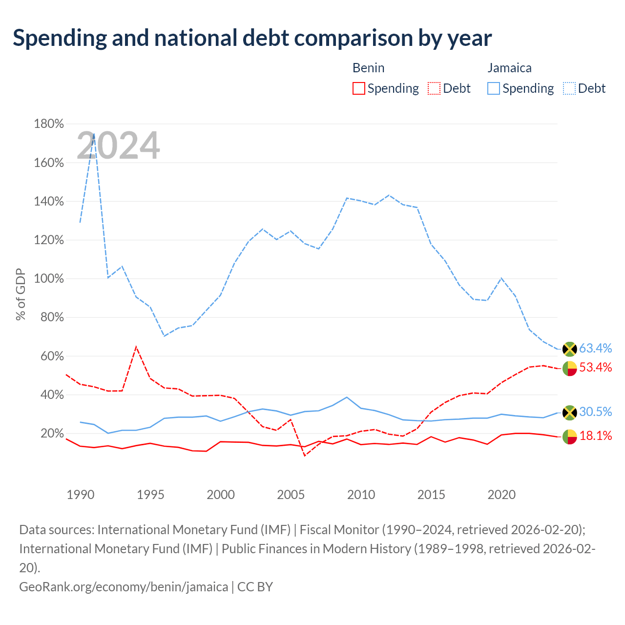 Benin has $11.5B in government debt (53.4% of GDP), compared to $14B (63.4% of GDP) in Jamaica.