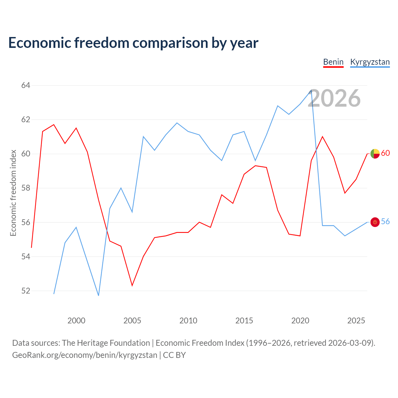 The Economic Freedom Index for Benin is 60, ranking 96/197, compared to 56 for Kyrgyzstan, ranking 126/197. The chart above displays a comparison of annual changes in economic freedom indexes.