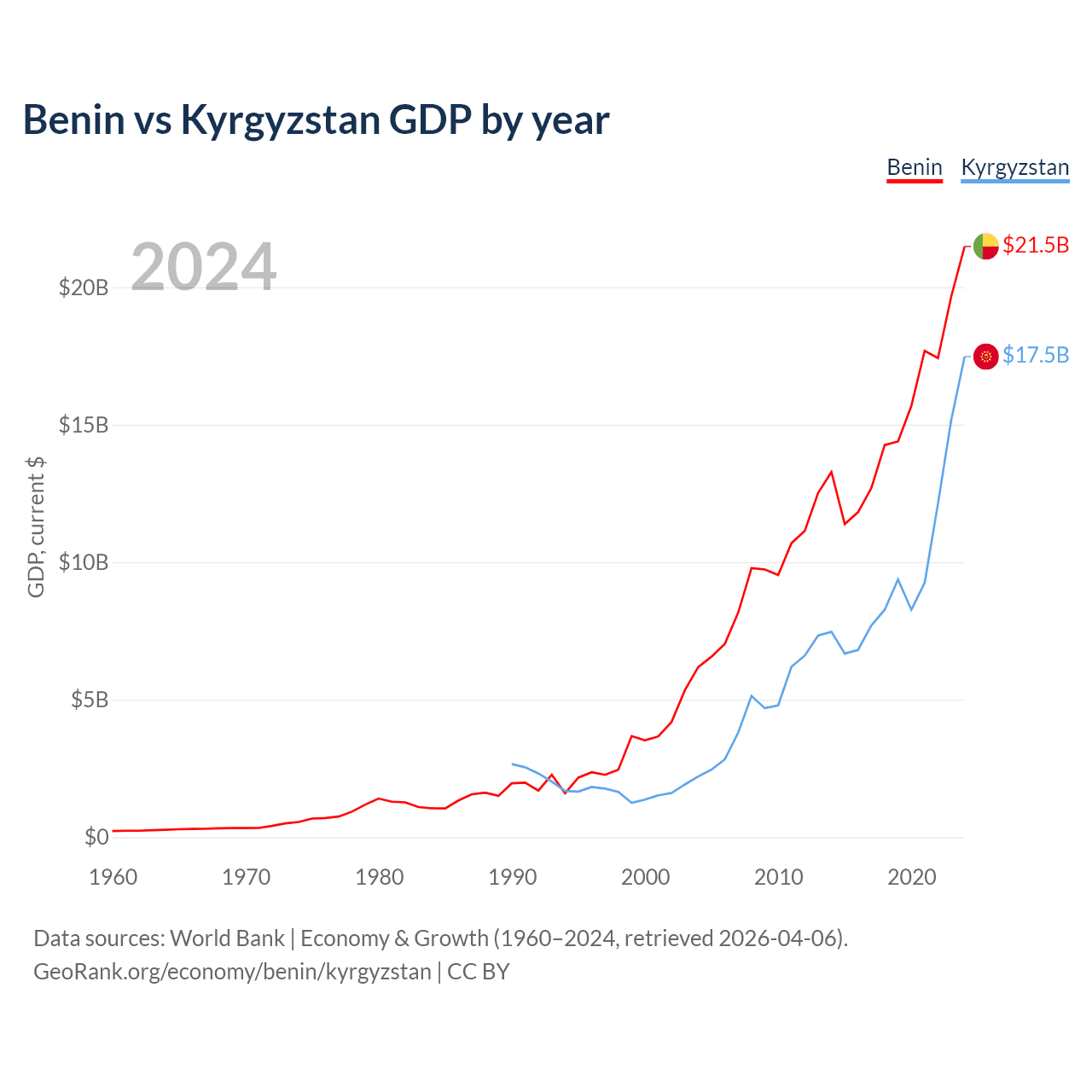 Benin has a GDP of $21.5B compared to $17.5B for Kyrgyzstan, ranking 126/197 and 135/197 by economy size, respectively.