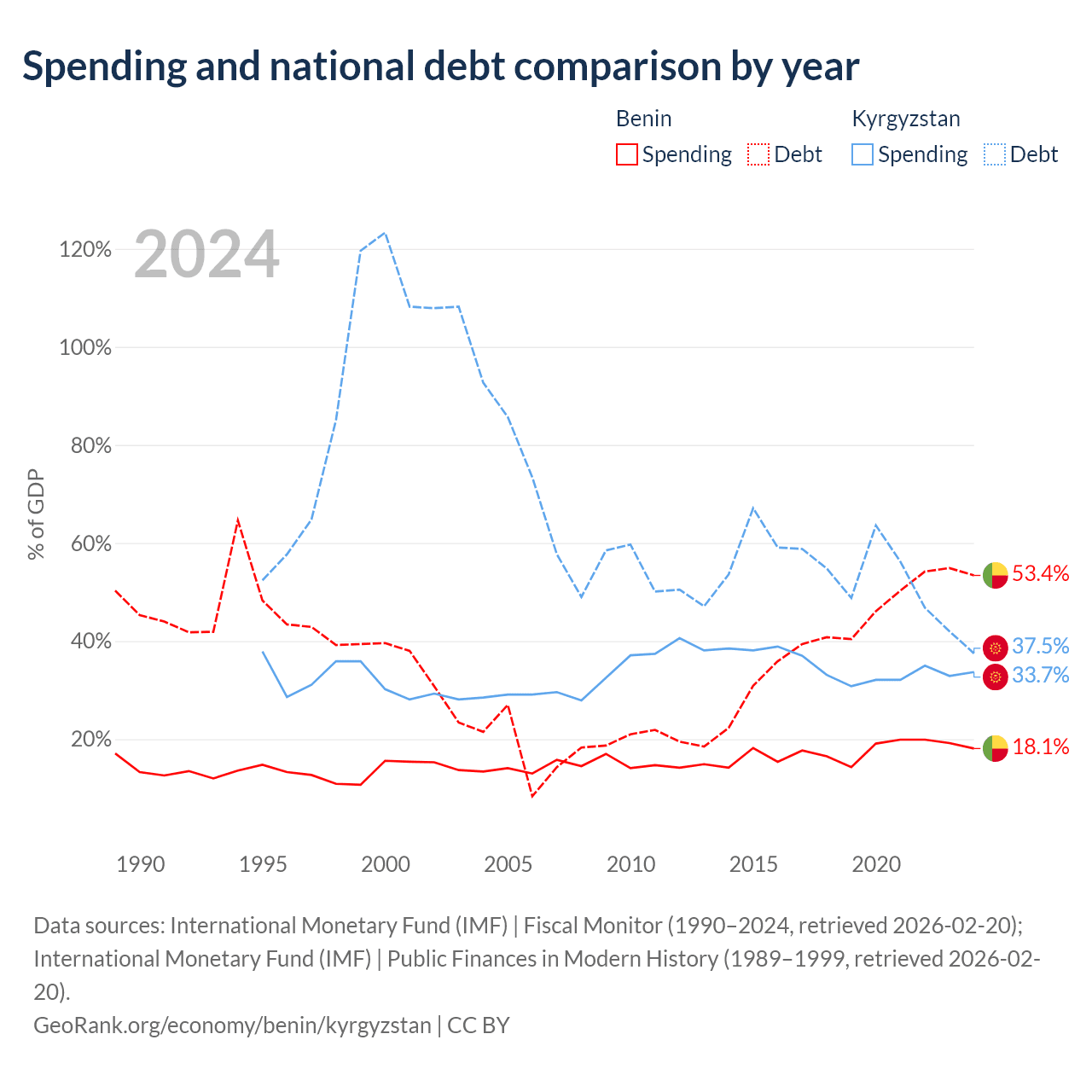 Benin has $11.5B in government debt (53.4% of GDP), compared to $6.56B (37.5% of GDP) in Kyrgyzstan.
