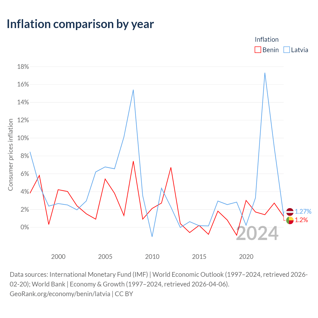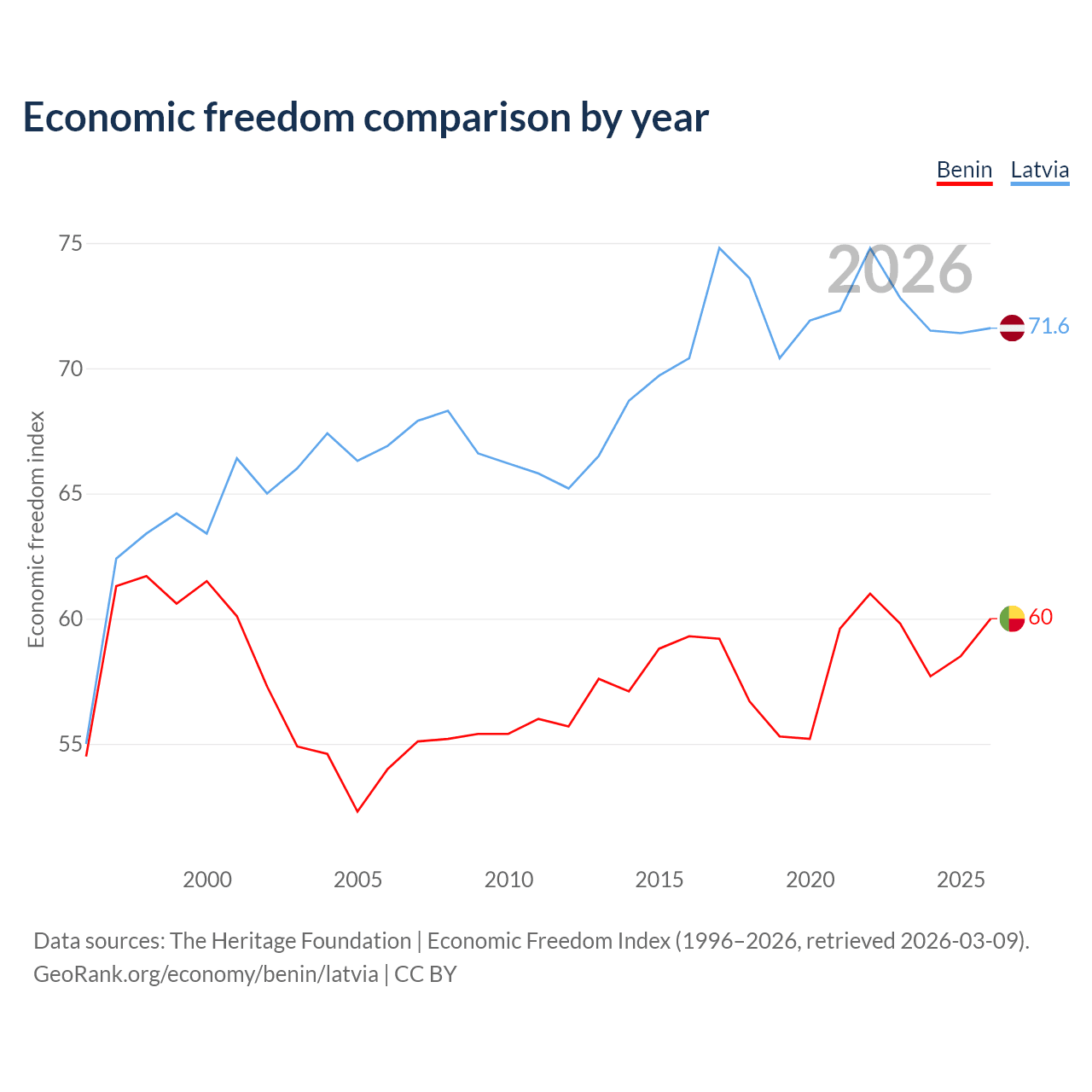 The Economic Freedom Index for Benin is 60, ranking 96/197, compared to 71.6 for Latvia, ranking 31/197. The chart above displays a comparison of annual changes in economic freedom indexes.