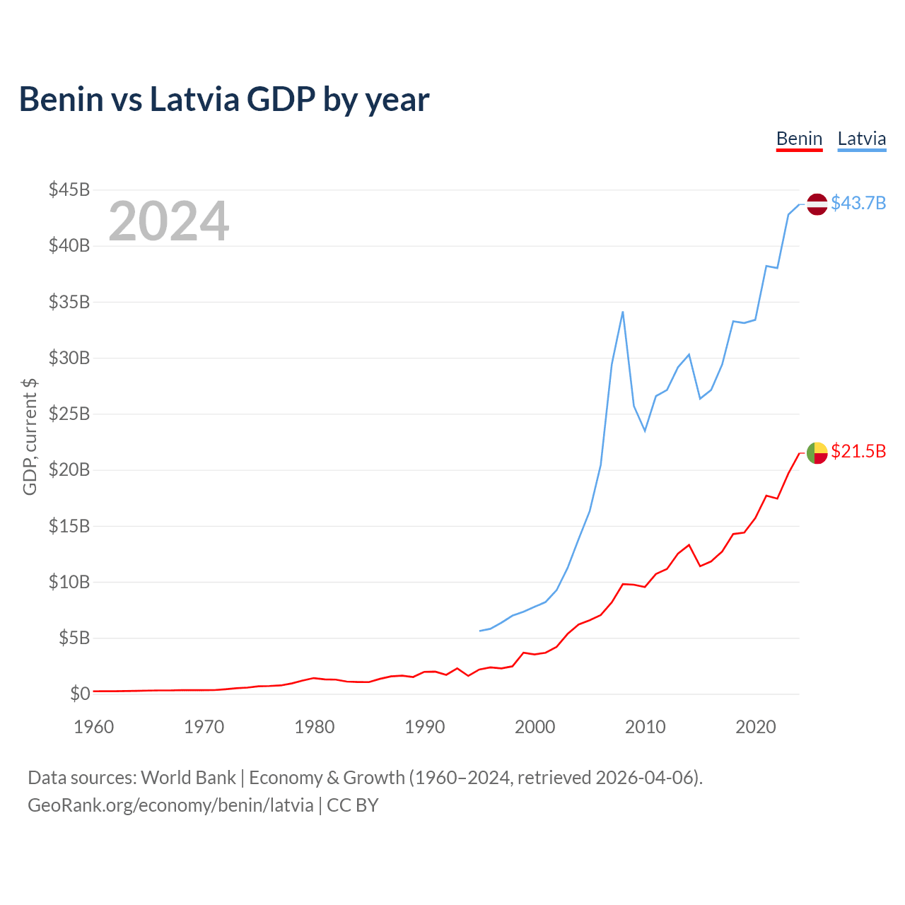 Benin has a GDP of $21.5B compared to $43.7B for Latvia, ranking 126/197 and 99/197 by economy size, respectively.