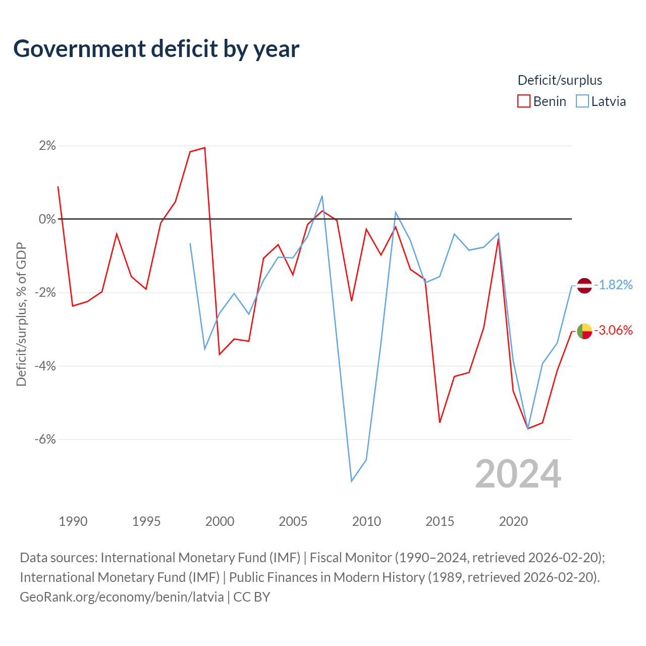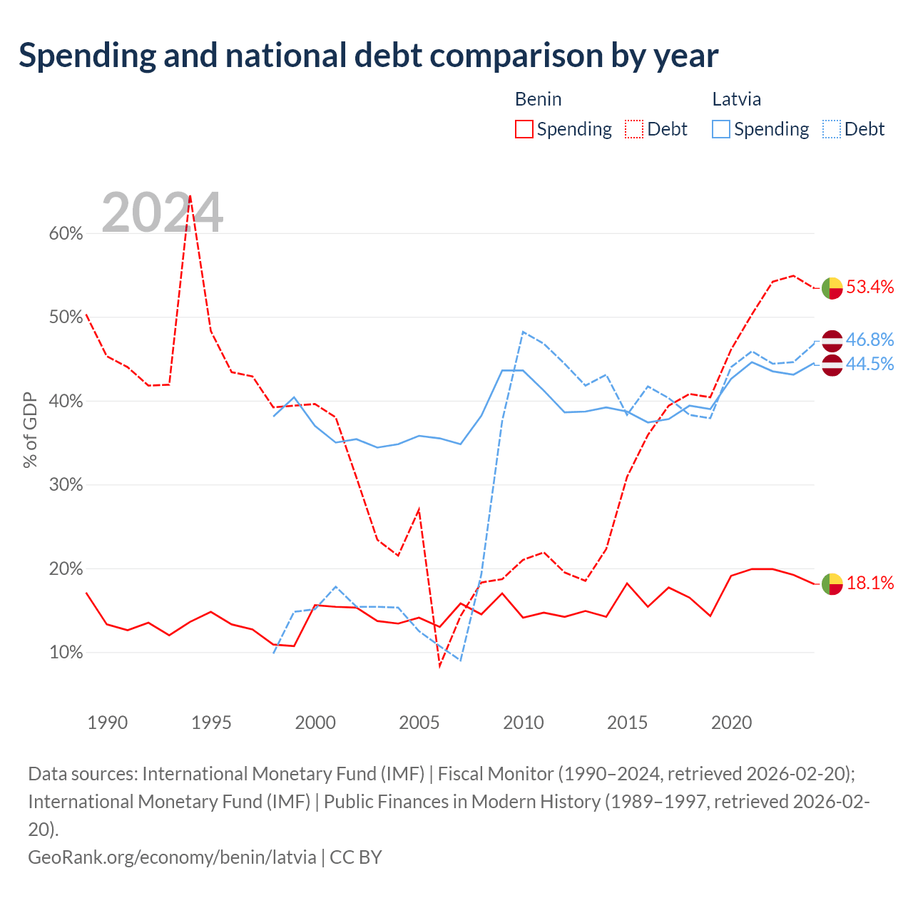 Benin has $11.5B in government debt (53.4% of GDP), compared to $20.4B (46.8% of GDP) in Latvia.