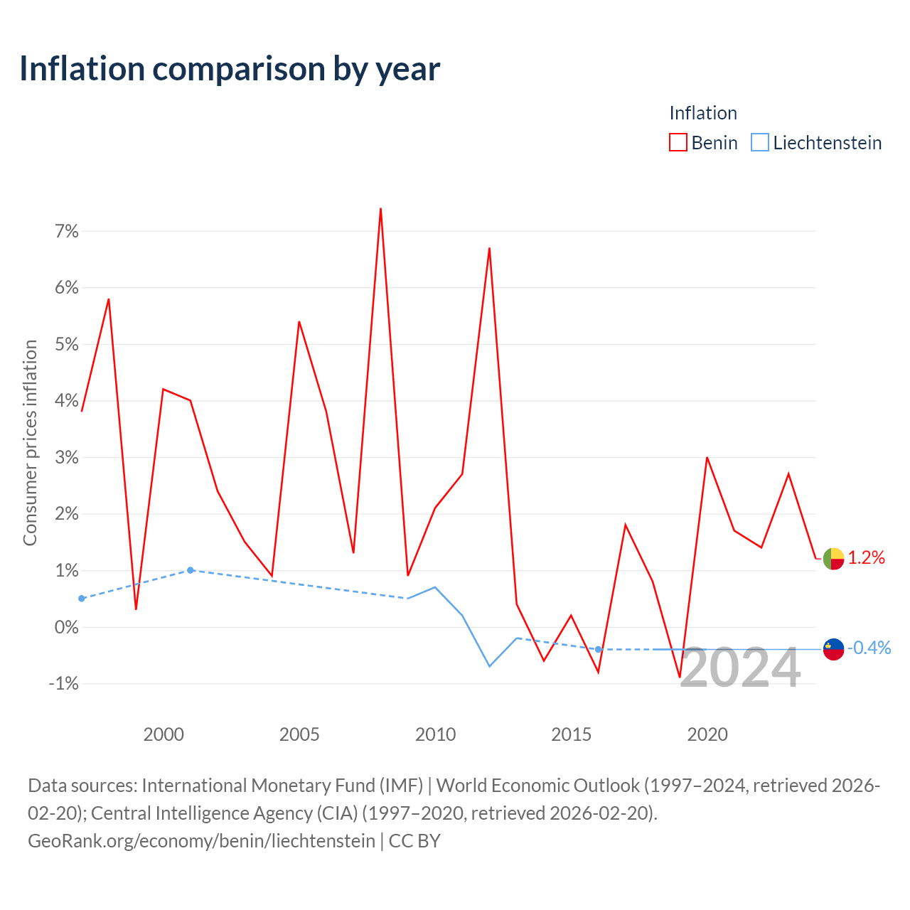 Over the past 24 years, Benin has recorded an average annual inflation rate of 2.38%, compared with 0.04% in Liechtenstein. In 2020, inflation was 1.2% in Benin and -0.4% in Liechtenstein.