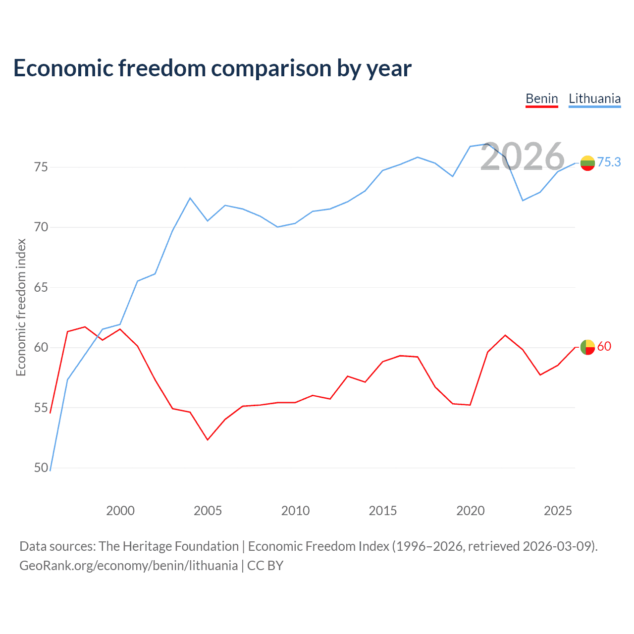 The Economic Freedom Index for Benin is 60, ranking 96/197, compared to 75.3 for Lithuania, ranking 18/197. The chart above displays a comparison of annual changes in economic freedom indexes.