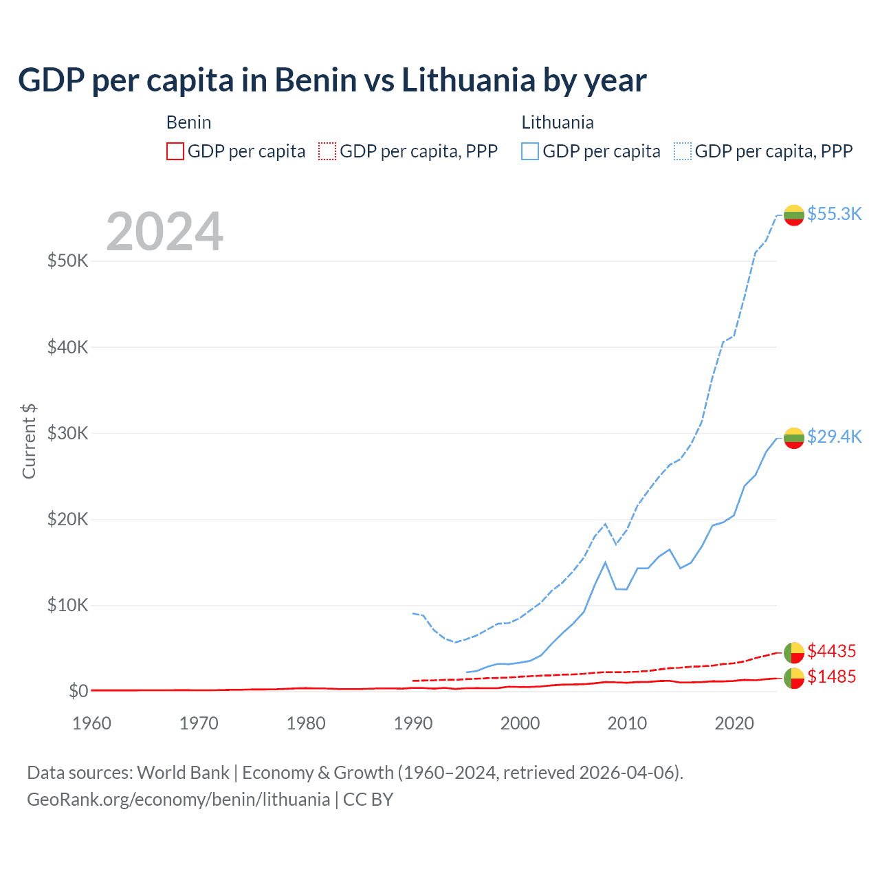 GDP per capita in Benin vs Lithuania by year