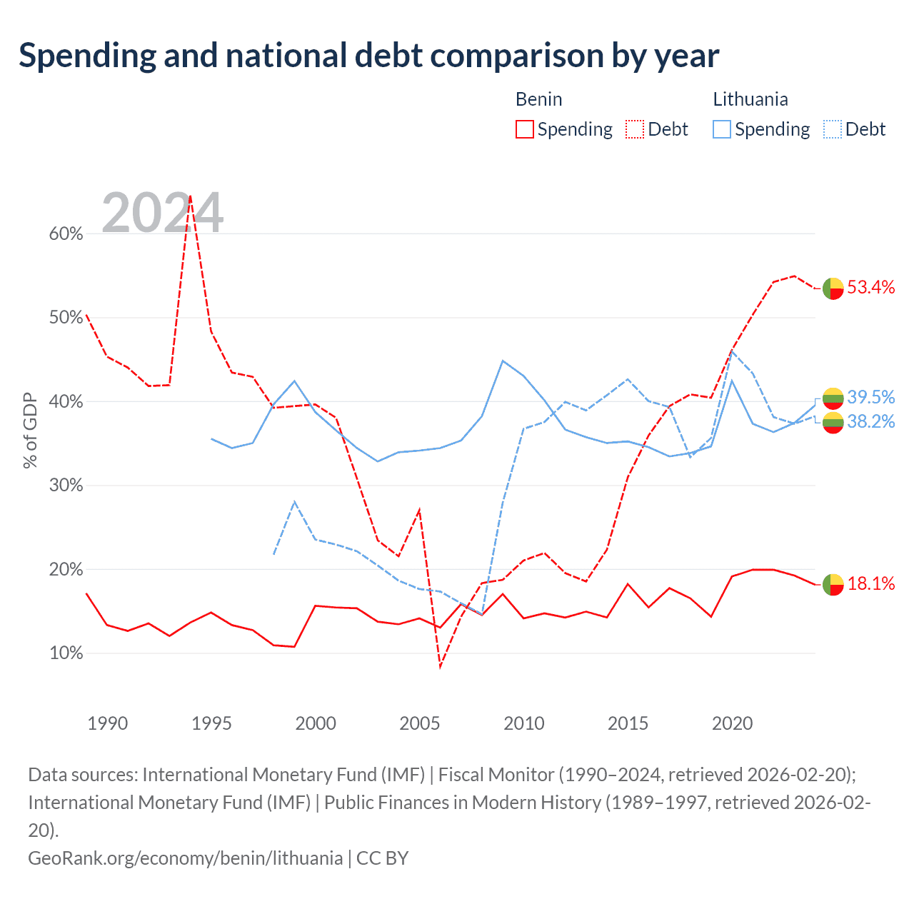 Benin has $11.5B in government debt (53.4% of GDP), compared to $32.4B (38.2% of GDP) in Lithuania.
