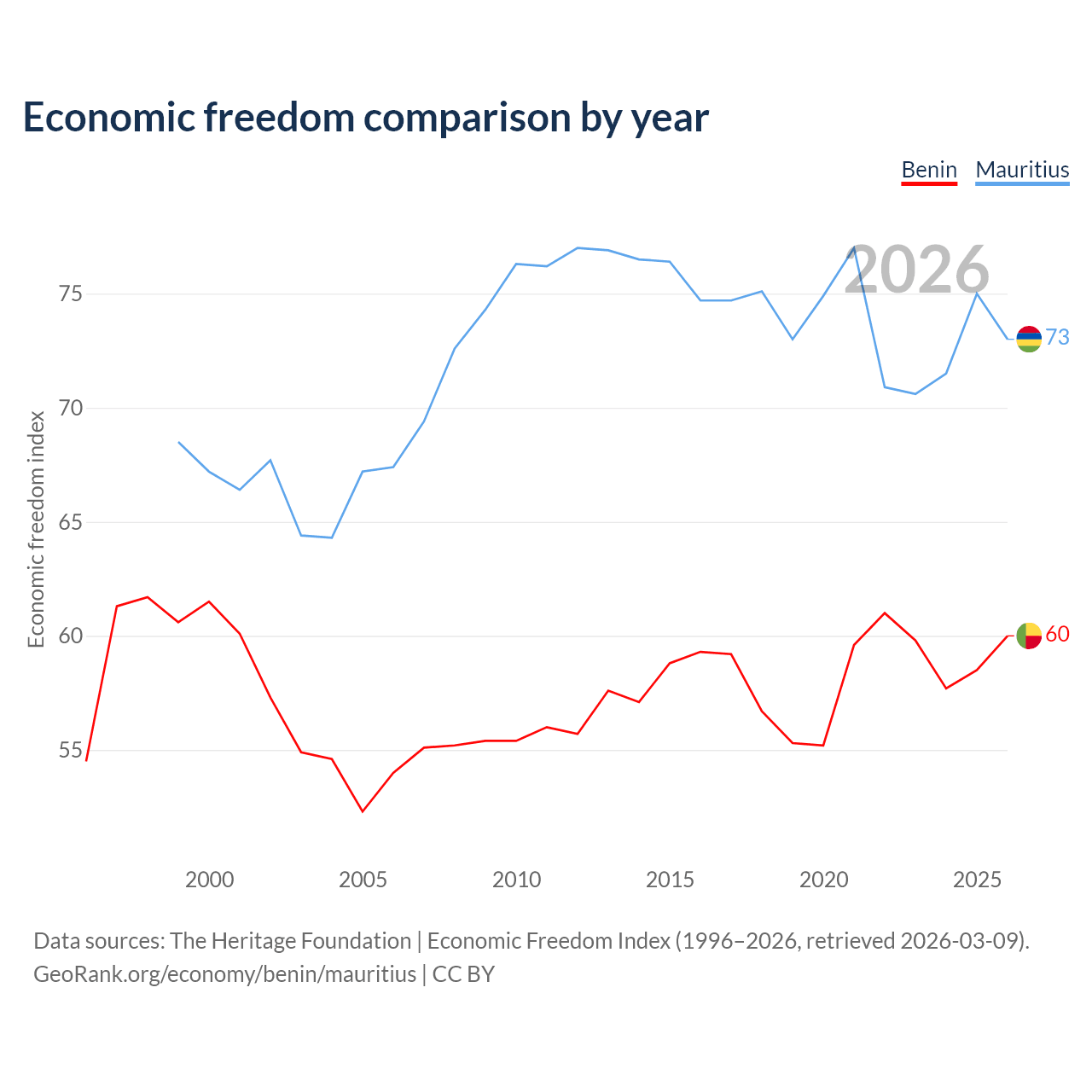 The Economic Freedom Index for Benin is 60, ranking 96/197, compared to 73 for Mauritius, ranking 26/197. The chart above displays a comparison of annual changes in economic freedom indexes.