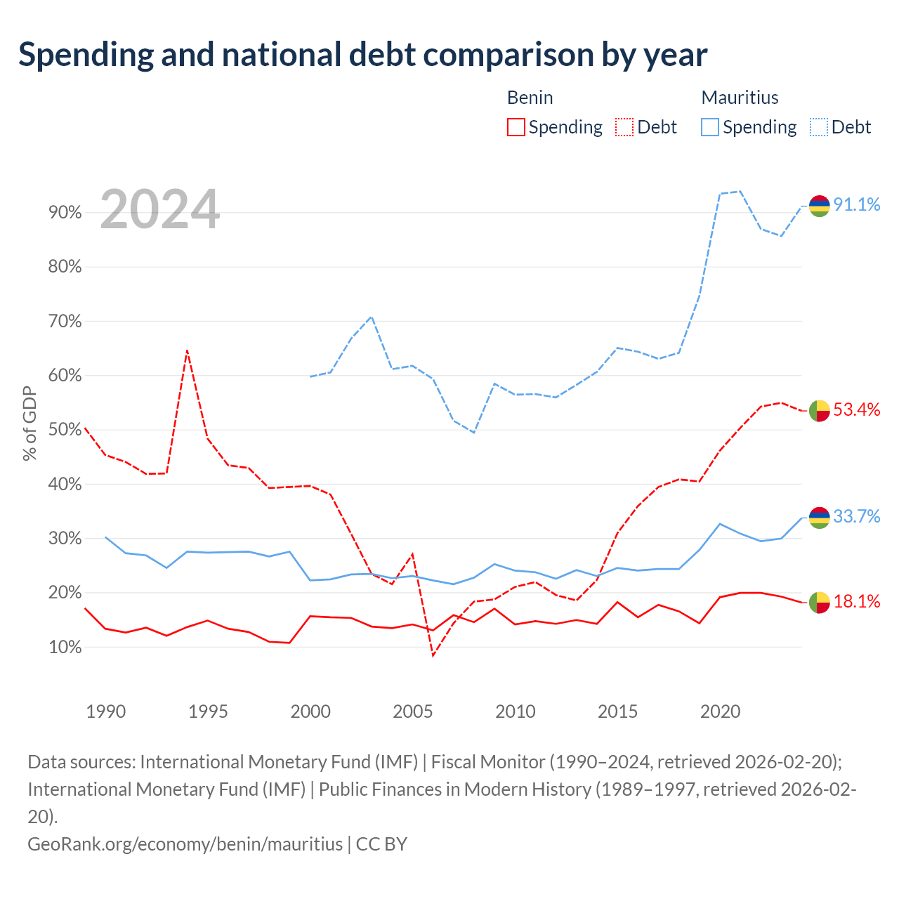 Benin has $11.5B in government debt (53.4% of GDP), compared to $13.6B (91.1% of GDP) in Mauritius.