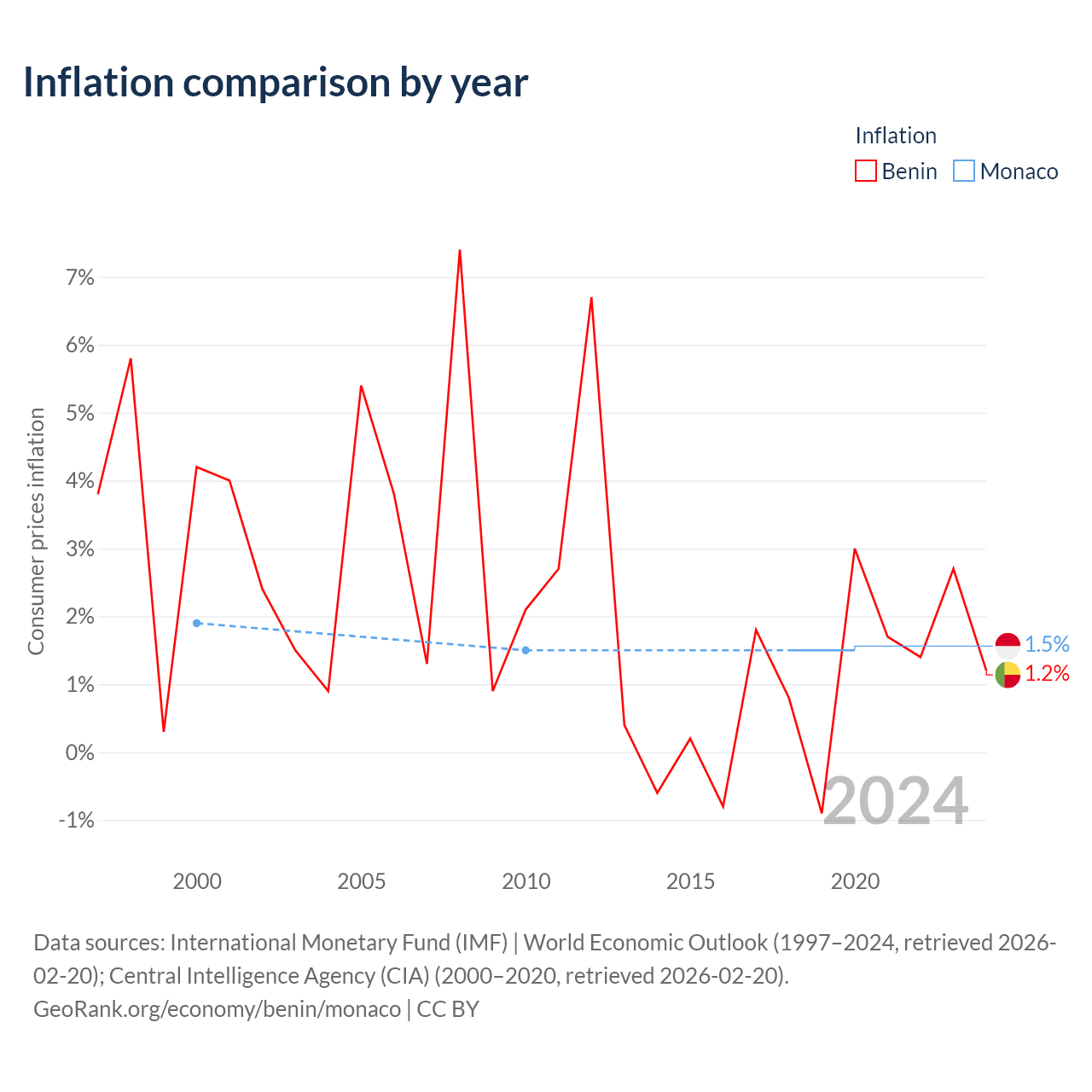 Over the past 21 years, Benin has recorded an average annual inflation rate of 2.25%, compared with 1.58% in Monaco. In 2020, inflation was 1.2% in Benin and 1.5% in Monaco.