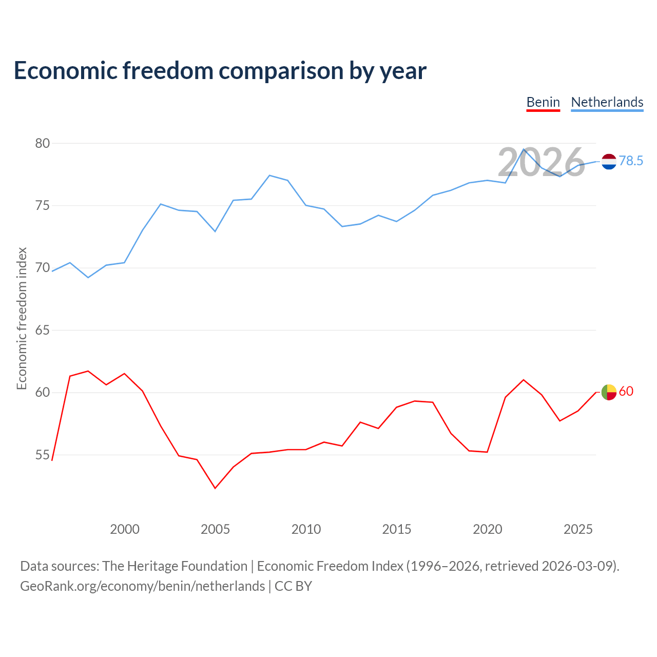The Economic Freedom Index for Benin is 60, ranking 96/197, compared to 78.5 for the Netherlands, ranking 11/197. The chart above displays a comparison of annual changes in economic freedom indexes.
