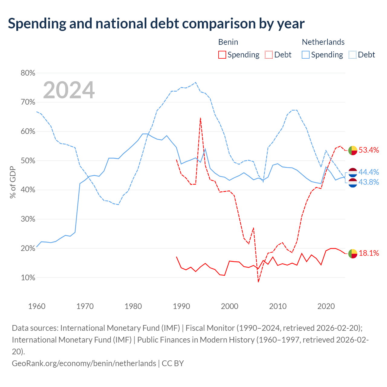 Benin has $11.5B in government debt (53.4% of GDP), compared to $532B (43.8% of GDP) in the Netherlands.