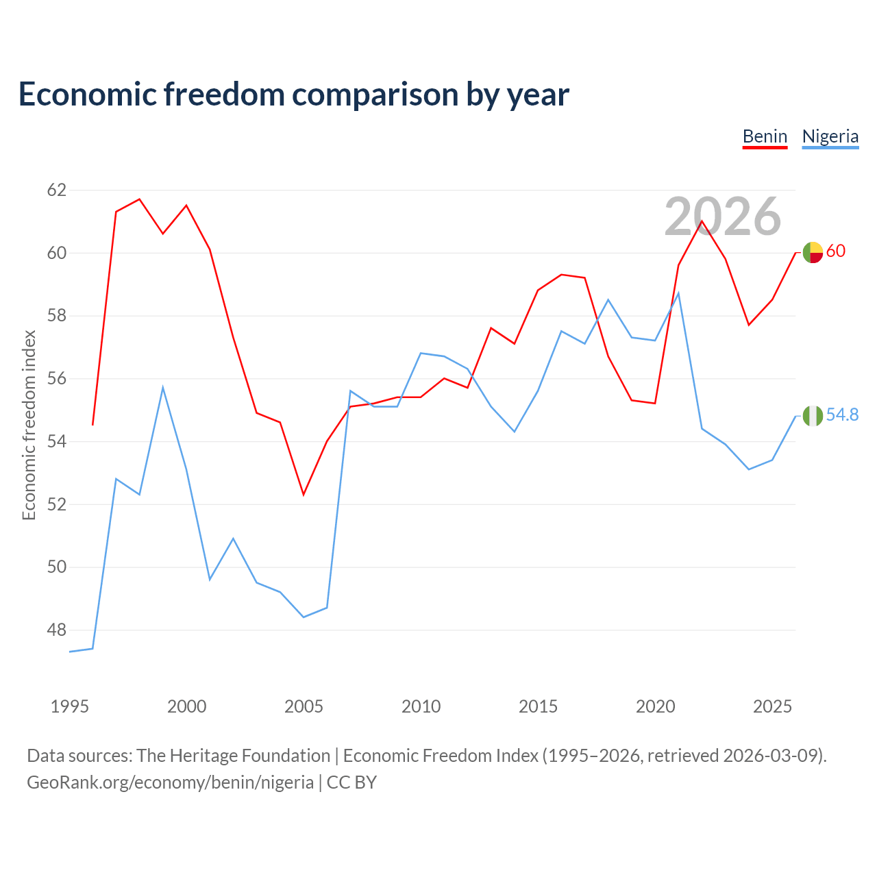 The Economic Freedom Index for Benin is 60, ranking 96/197, compared to 54.8 for Nigeria, ranking 132/197. The chart above displays a comparison of annual changes in economic freedom indexes.
