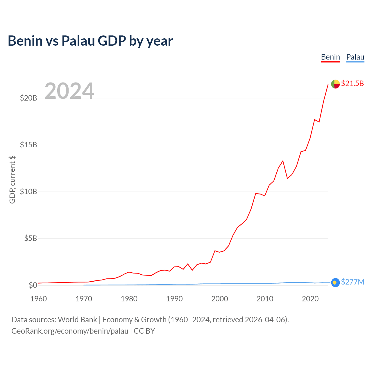 Benin has a GDP of $21.5B compared to $277M for Palau, ranking 126/197 and 194/197 by economy size, respectively.