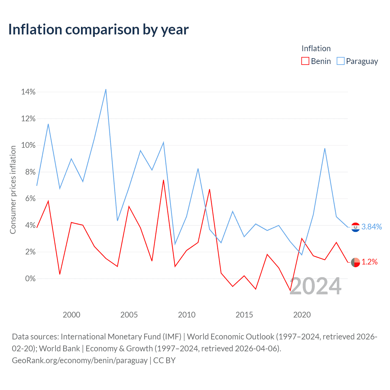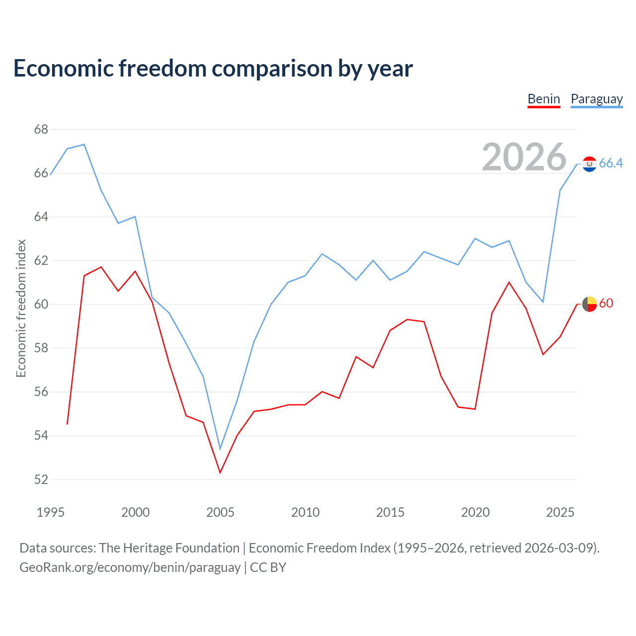 The Economic Freedom Index for Benin is 60, ranking 96/197, compared to 66.4 for Paraguay, ranking 61/197. The chart above displays a comparison of annual changes in economic freedom indexes.