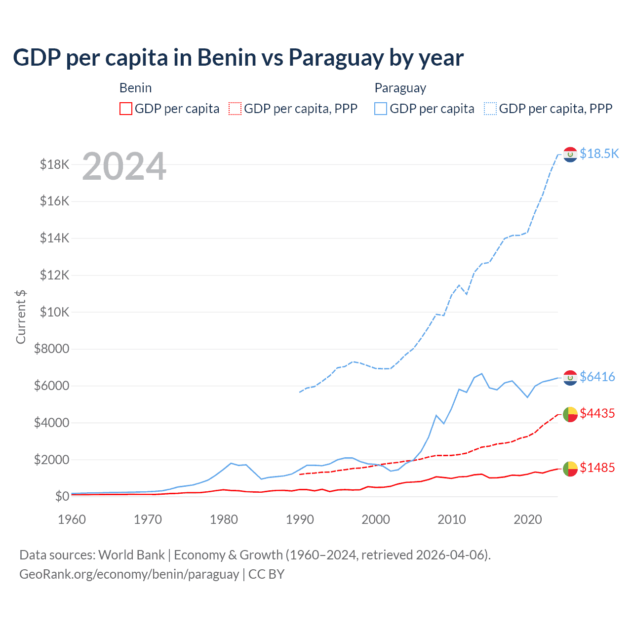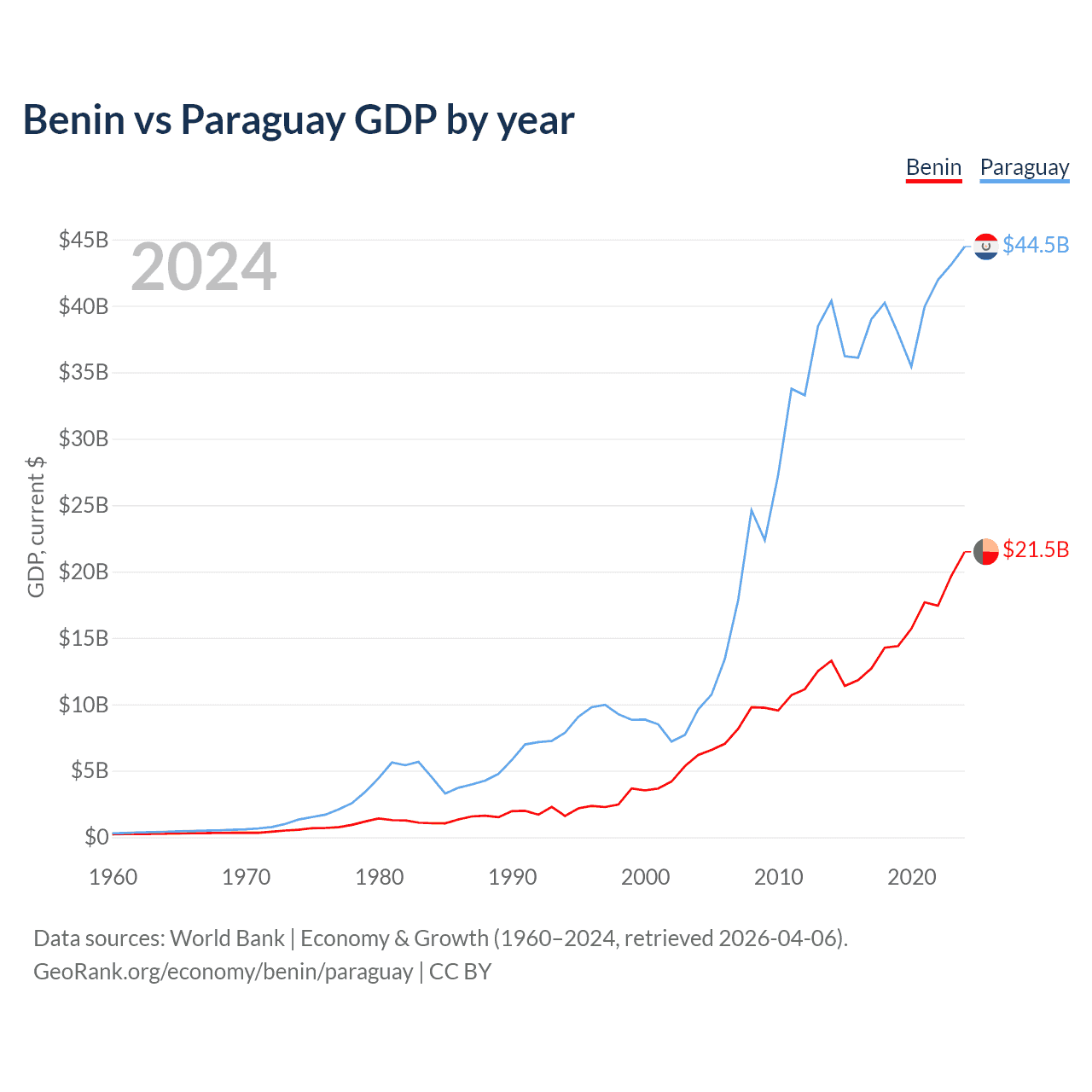 Benin has a GDP of $21.5B compared to $44.5B for Paraguay, ranking 126/197 and 98/197 by economy size, respectively.