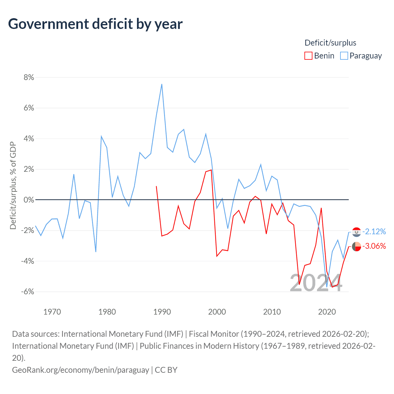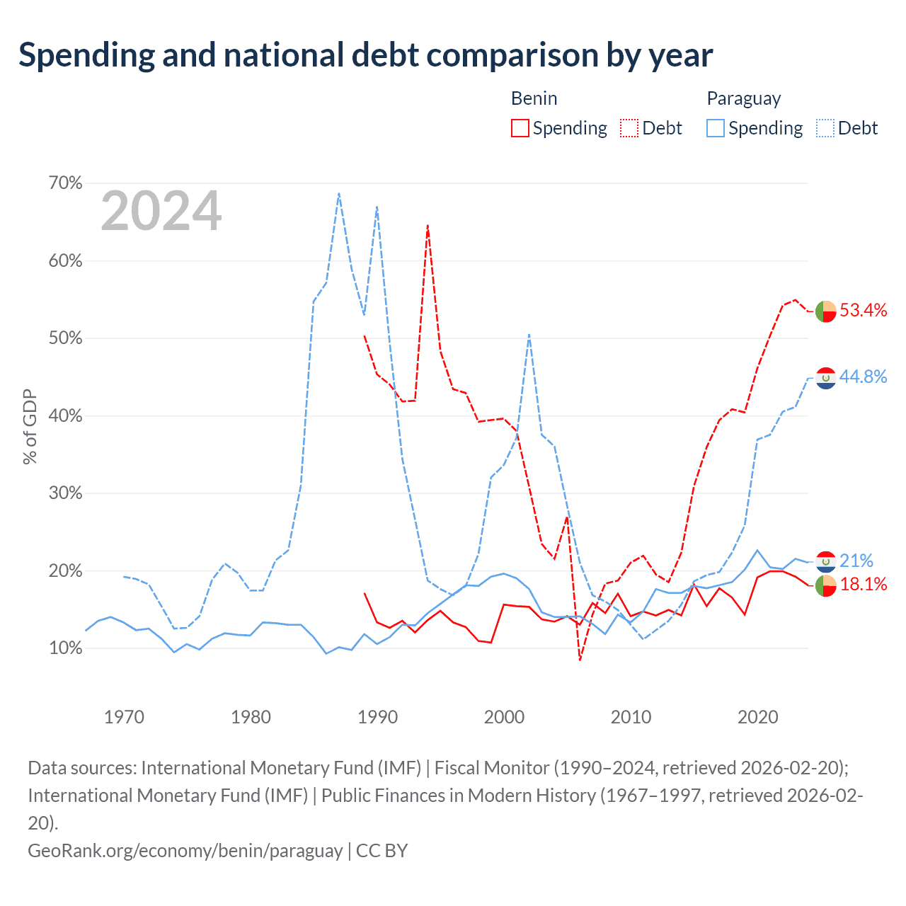 Benin has $11.5B in government debt (53.4% of GDP), compared to $19.9B (44.8% of GDP) in Paraguay.