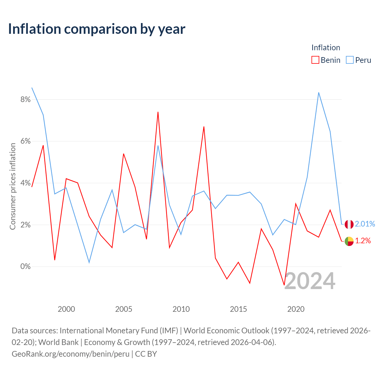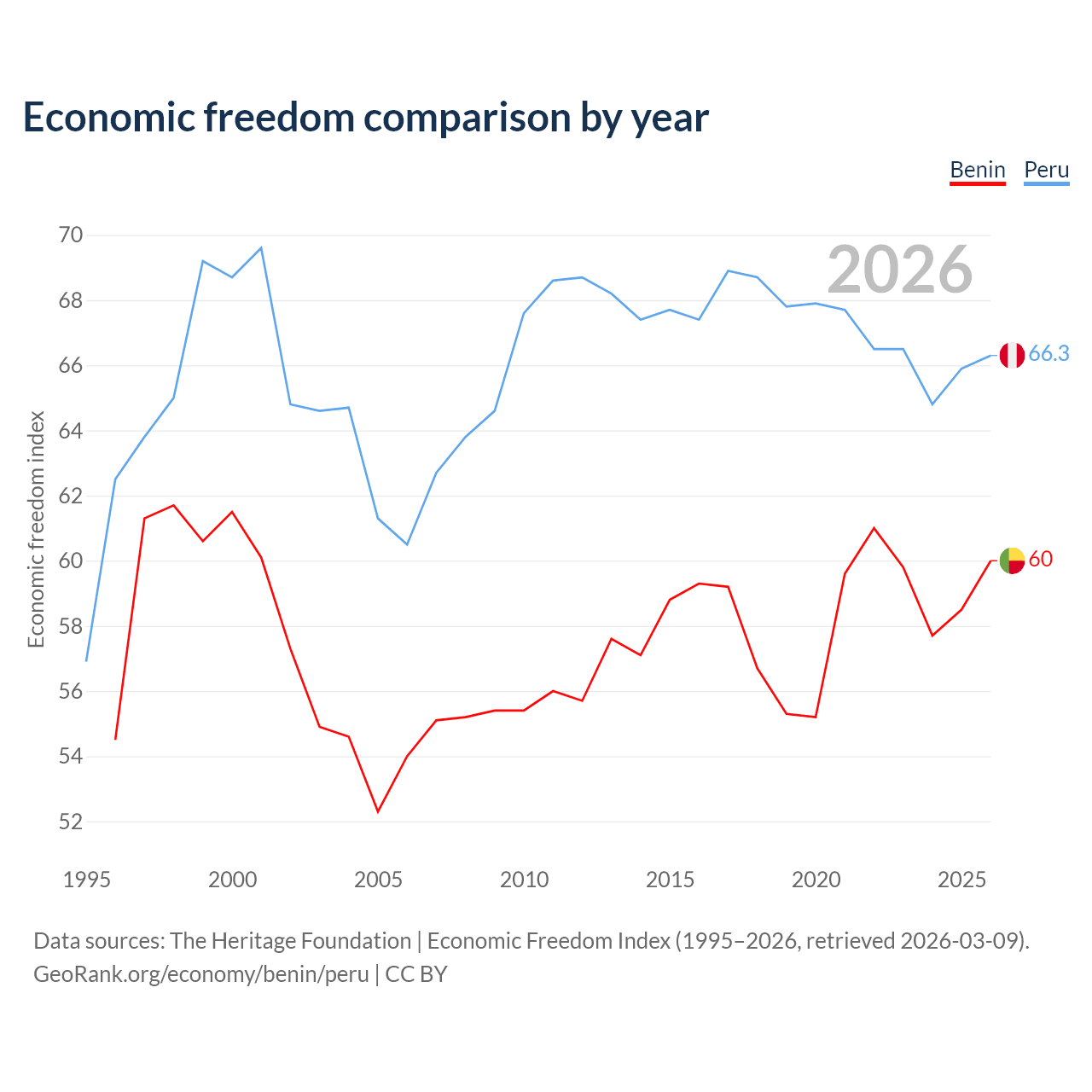 The Economic Freedom Index for Benin is 60, ranking 96/197, compared to 66.3 for Peru, ranking 62/197. The chart above displays a comparison of annual changes in economic freedom indexes.