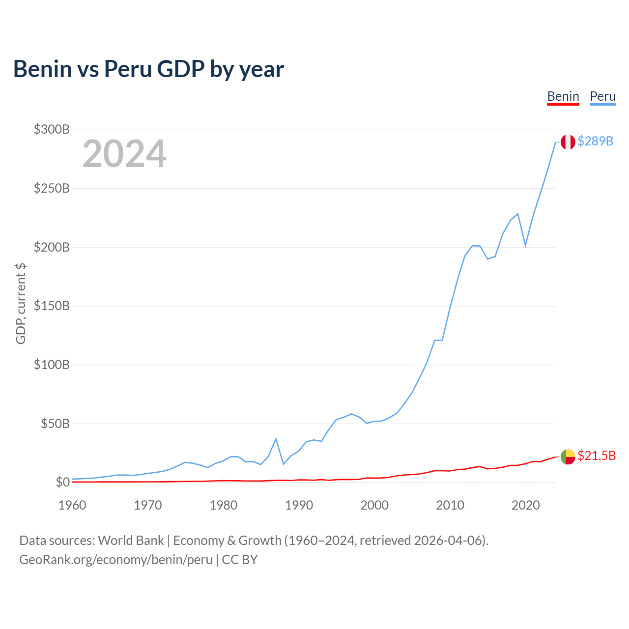 Benin has a GDP of $21.5B compared to $289B for Peru, ranking 126/197 and 49/197 by economy size, respectively.
