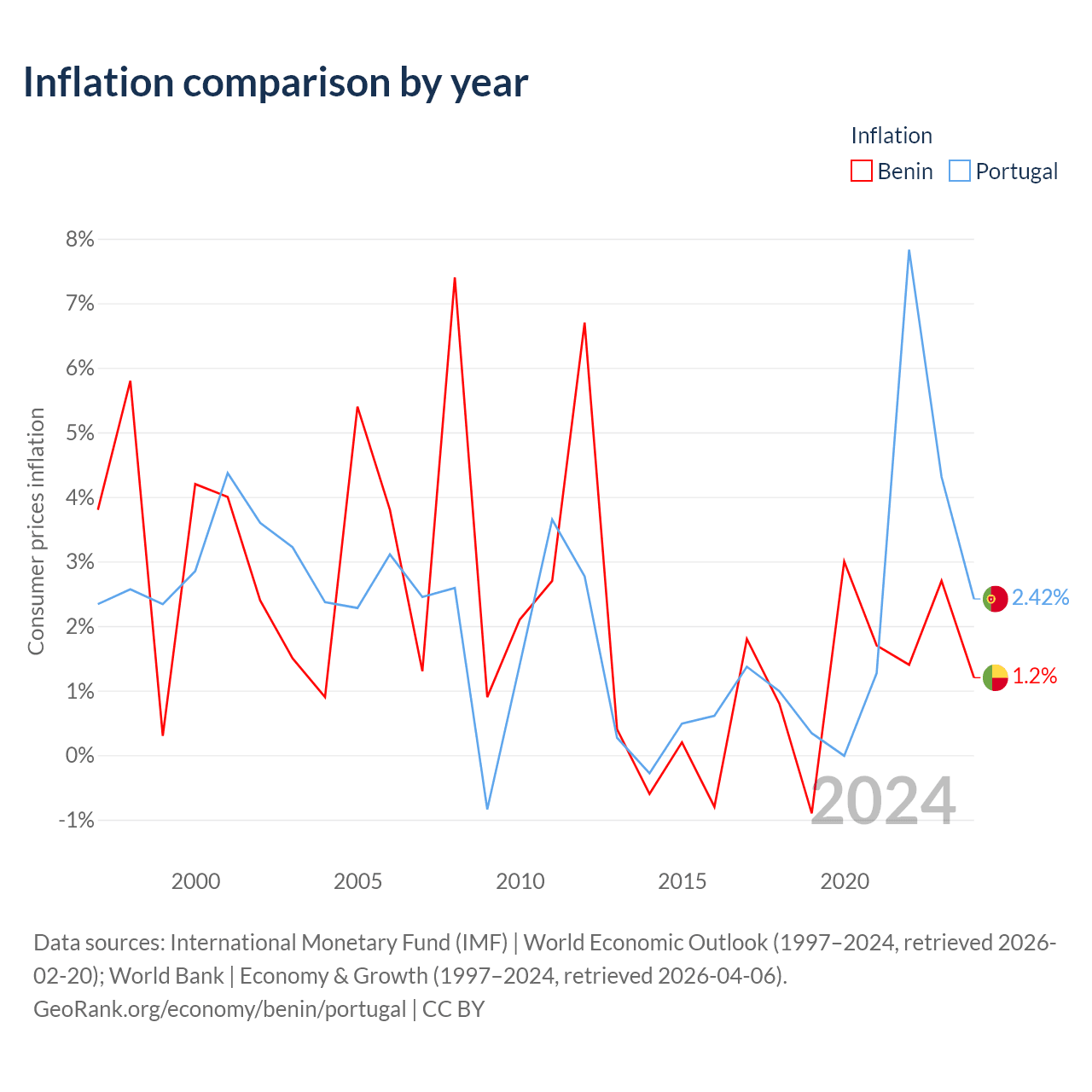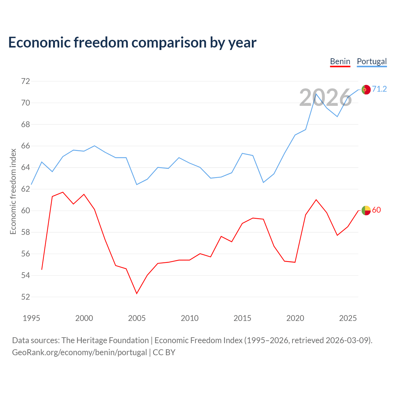 The Economic Freedom Index for Benin is 60, ranking 96/197, compared to 71.2 for Portugal, ranking 33/197. The chart above displays a comparison of annual changes in economic freedom indexes.