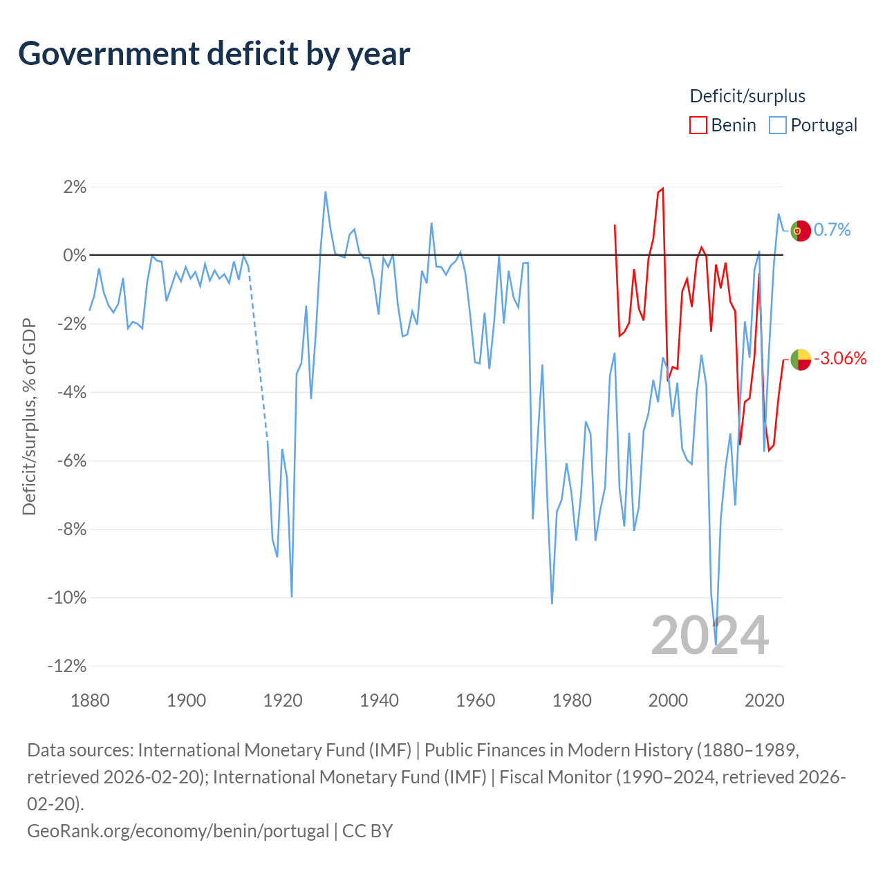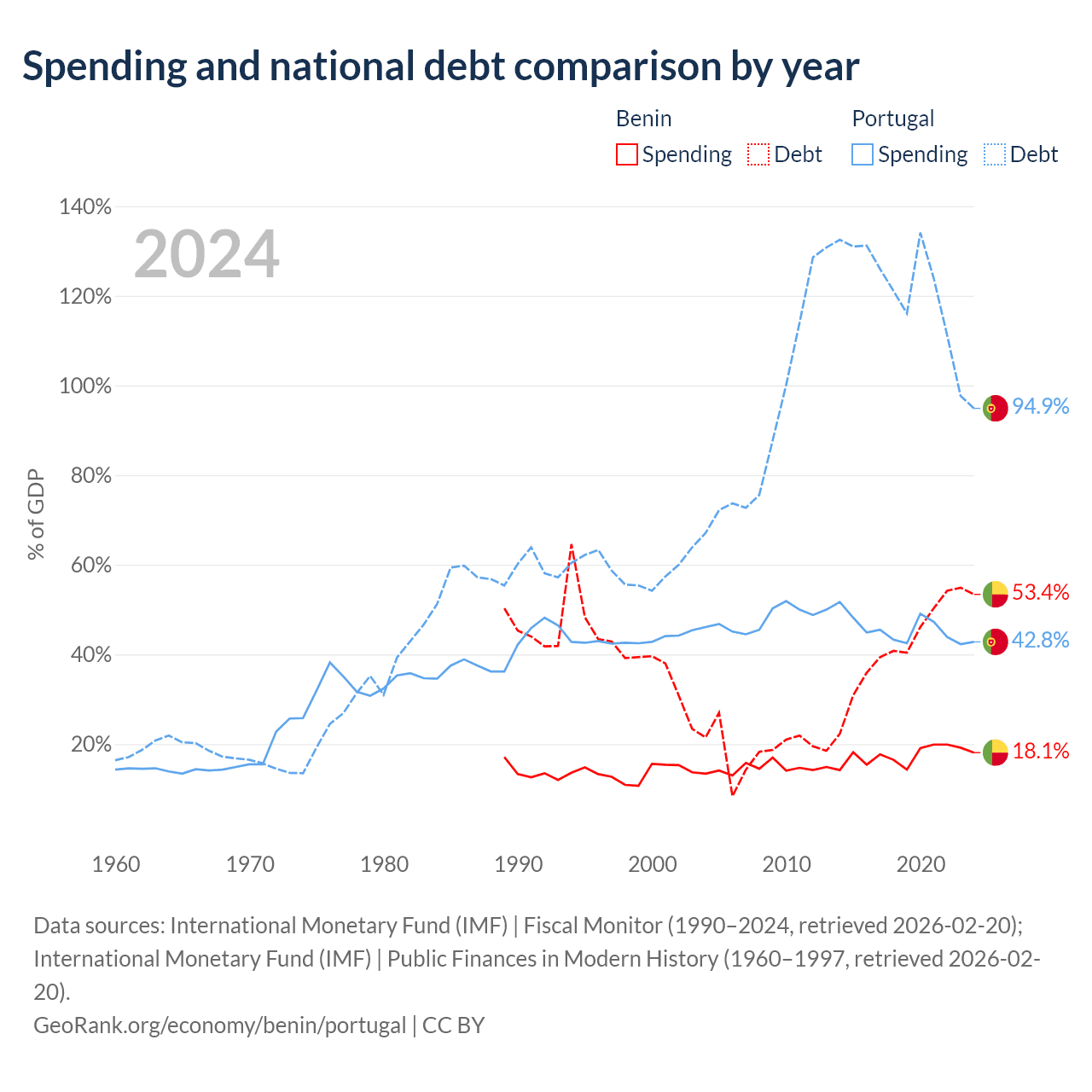 Benin has $11.5B in government debt (53.4% of GDP), compared to $297B (94.9% of GDP) in Portugal.