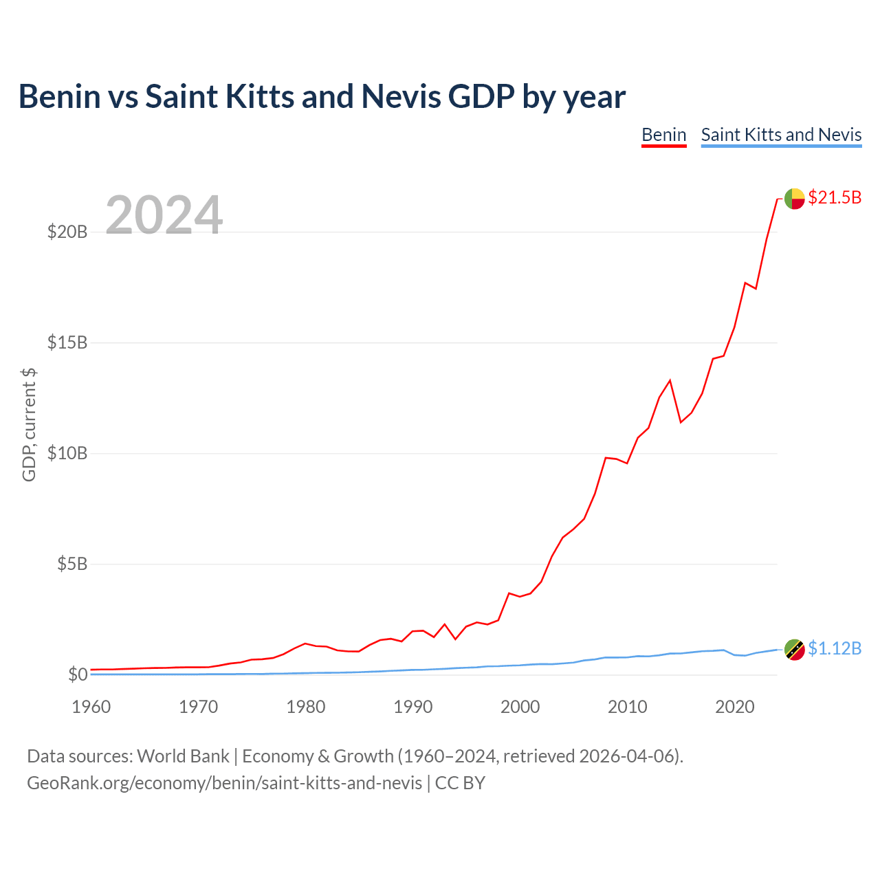 Benin has a GDP of $21.5B compared to $1.12B for Saint Kitts and Nevis, ranking 126/197 and 187/197 by economy size, respectively.