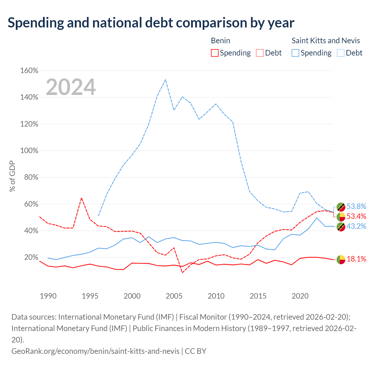 Benin has $11.5B in government debt (53.4% of GDP), compared to $604M (53.8% of GDP) in Saint Kitts and Nevis.