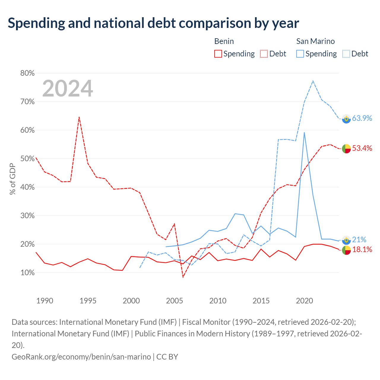 Benin has $11.5B in government debt (53.4% of GDP), compared to $1.39B (63.9% of GDP) in San Marino.