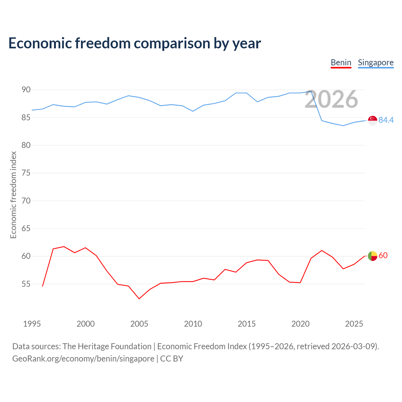 The Economic Freedom Index for Benin is 60, ranking 96/197, compared to 84.4 for Singapore, ranking 1/197. The chart above displays a comparison of annual changes in economic freedom indexes.