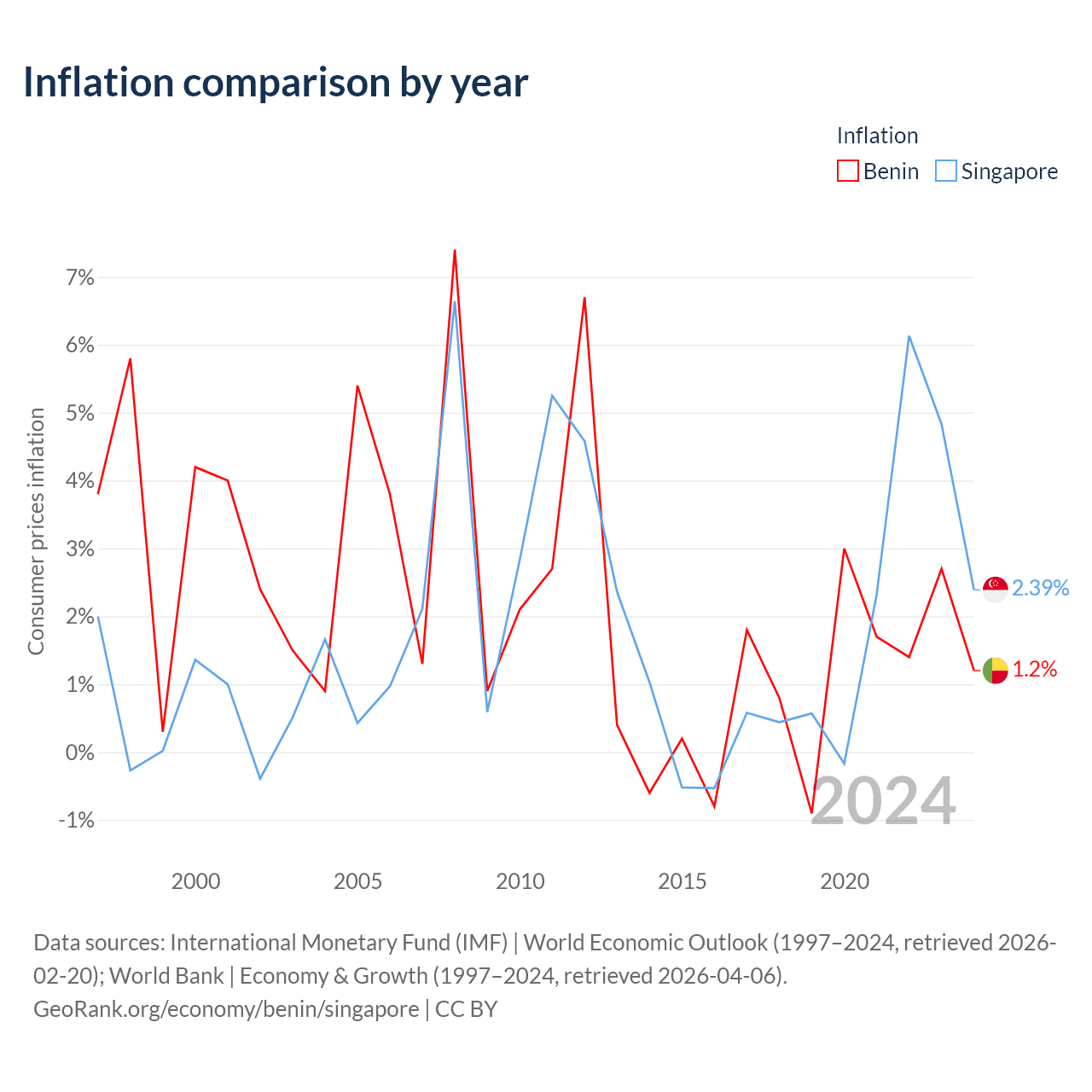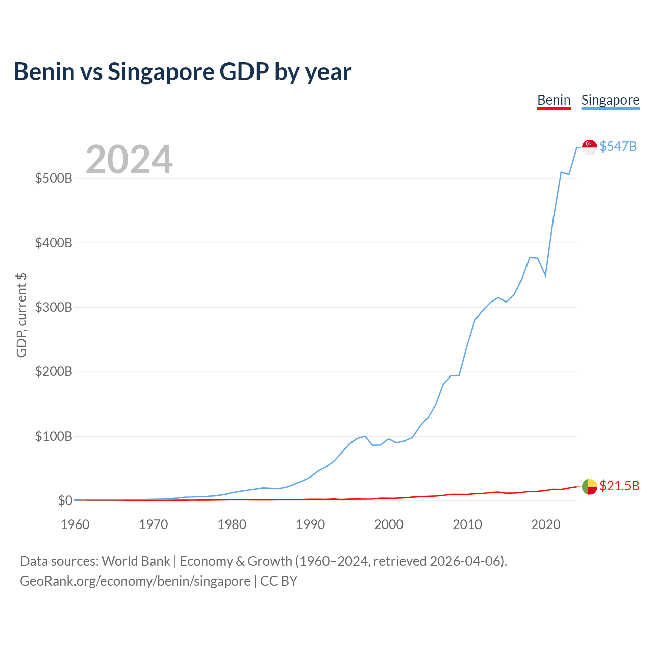 Benin has a GDP of $21.5B compared to $547B for Singapore, ranking 126/197 and 28/197 by economy size, respectively.