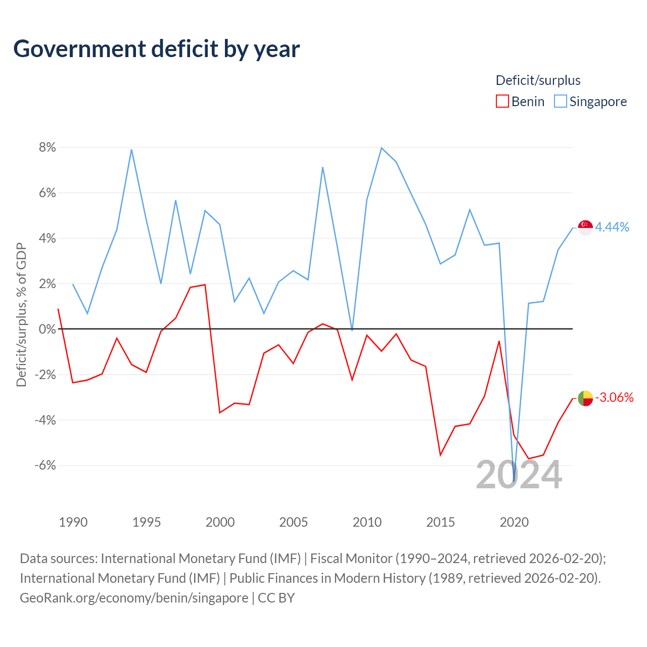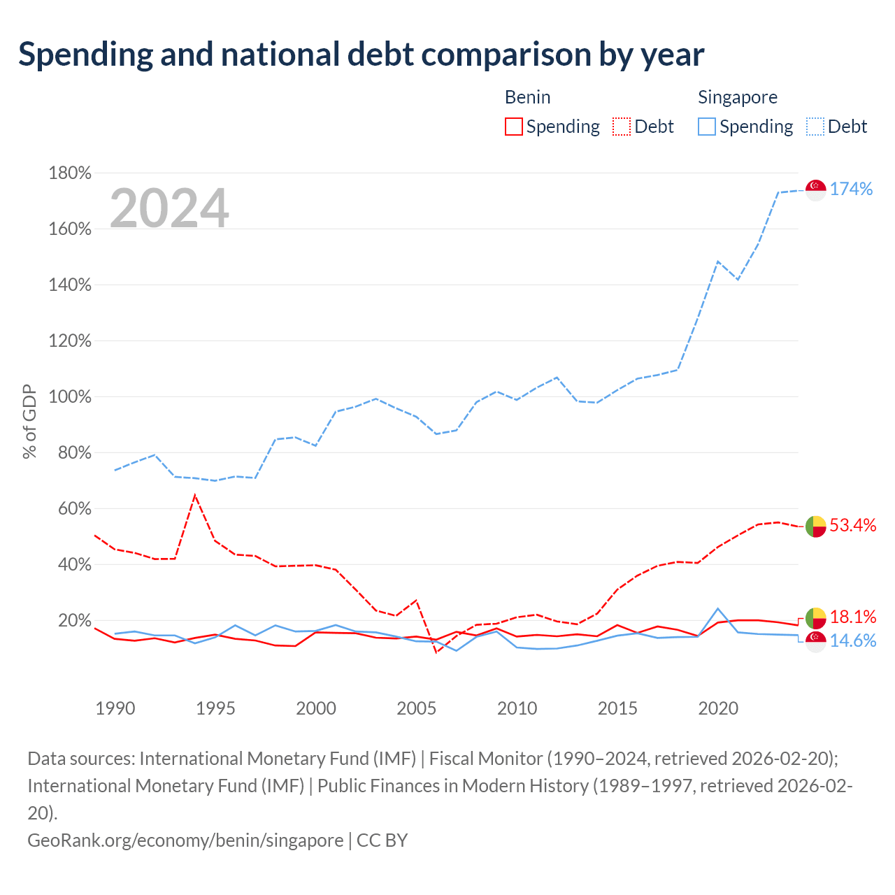 Benin has $11.5B in government debt (53.4% of GDP), compared to $950B (173.5% of GDP) in Singapore.