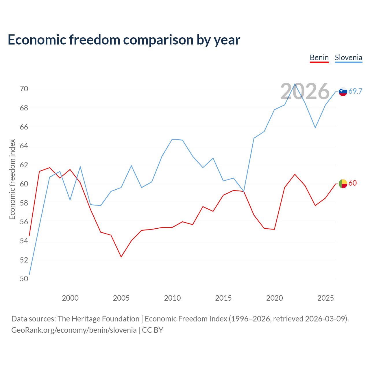 The Economic Freedom Index for Benin is 60, ranking 96/197, compared to 69.7 for Slovenia, ranking 40/197. The chart above displays a comparison of annual changes in economic freedom indexes.