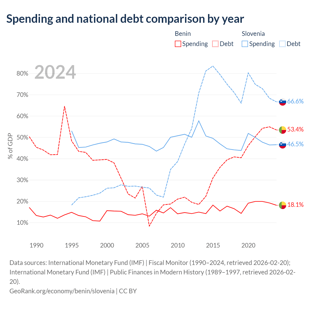 Benin has $11.5B in government debt (53.4% of GDP), compared to $48.6B (66.6% of GDP) in Slovenia.