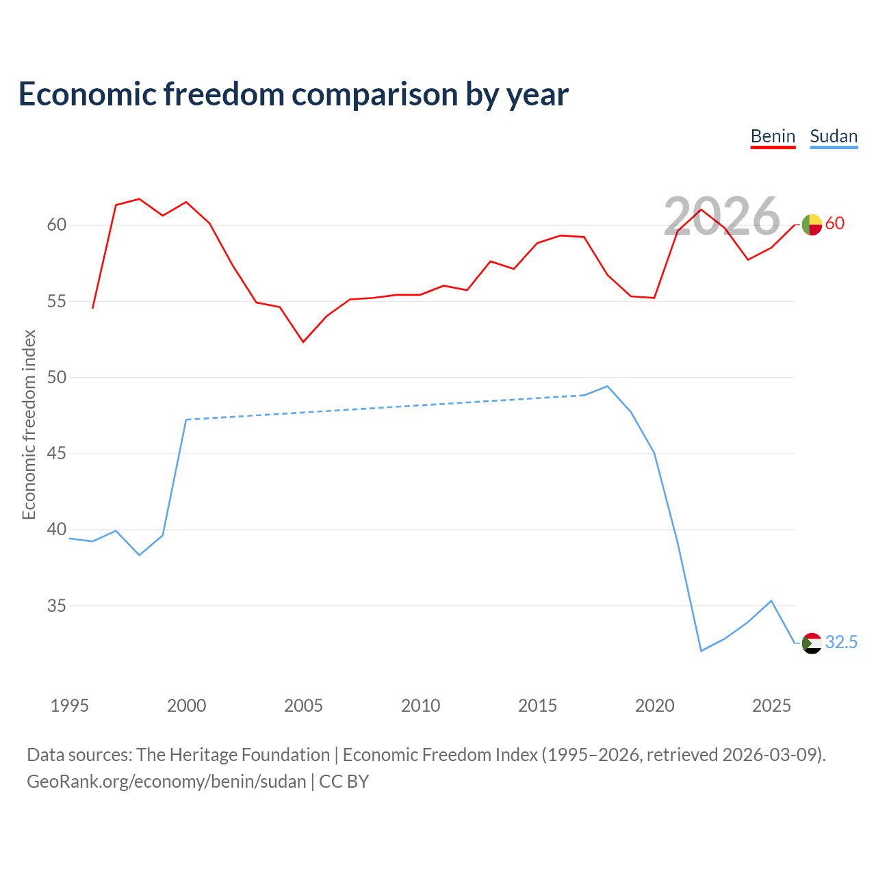 The Economic Freedom Index for Benin is 60, ranking 96/197, compared to 32.5 for Sudan, ranking 191/197. The chart above displays a comparison of annual changes in economic freedom indexes.