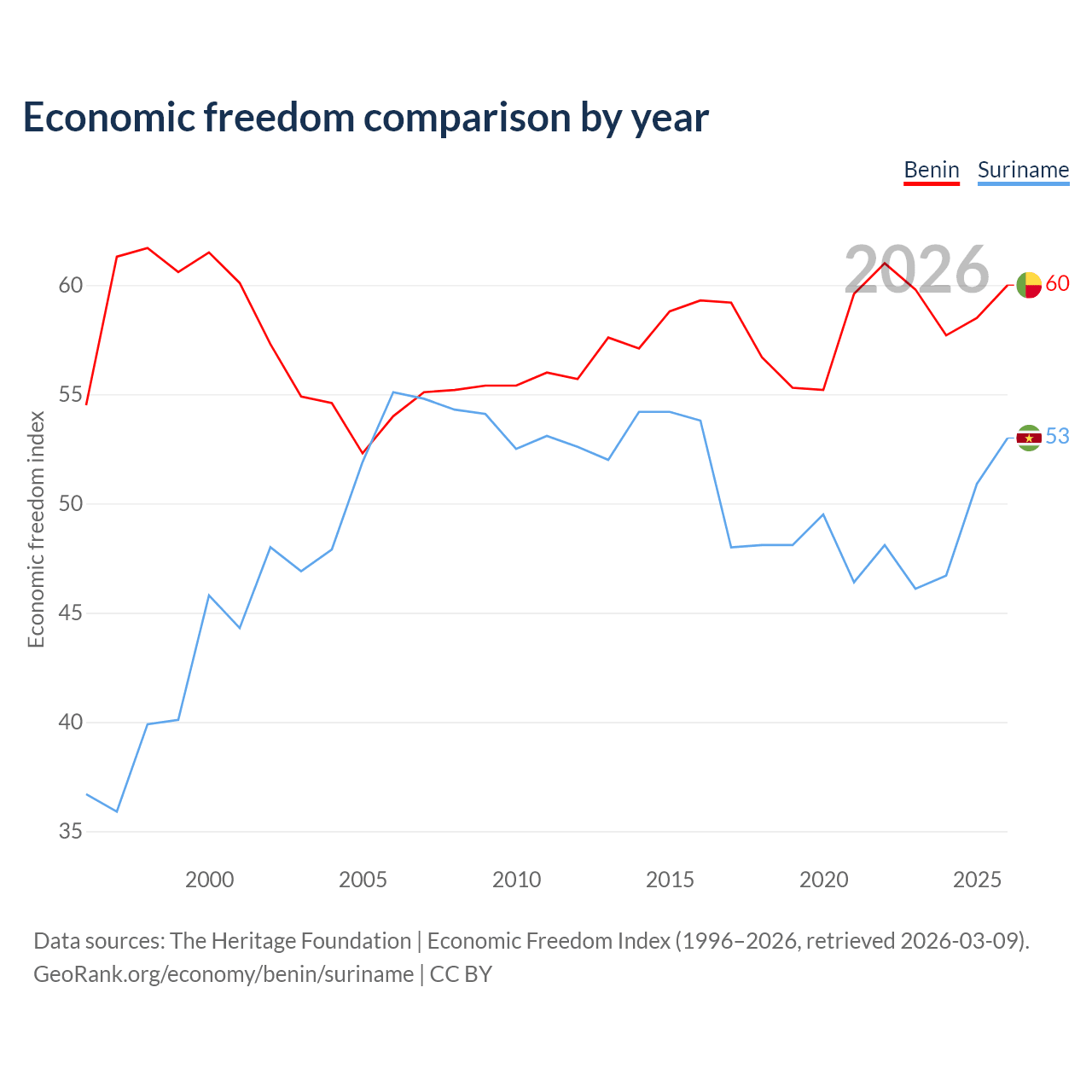The Economic Freedom Index for Benin is 60, ranking 96/197, compared to 53 for Suriname, ranking 143/197. The chart above displays a comparison of annual changes in economic freedom indexes.