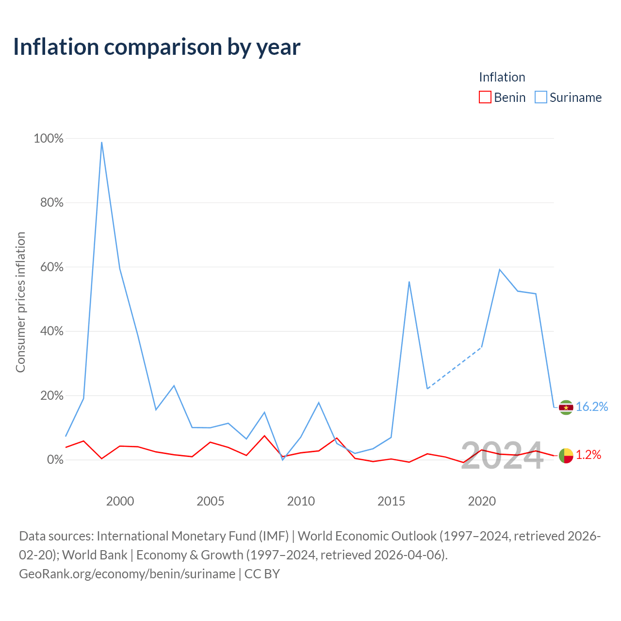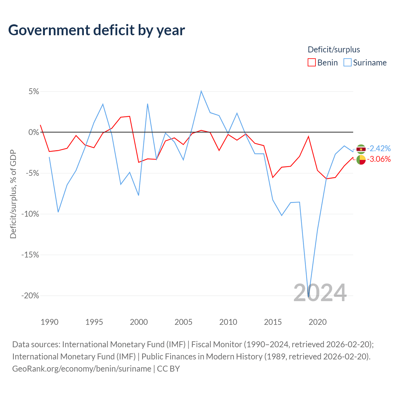 Benin has a GDP of $21.5B compared to $4.42B for Suriname, ranking 126/197 and 164/197 by economy size, respectively.