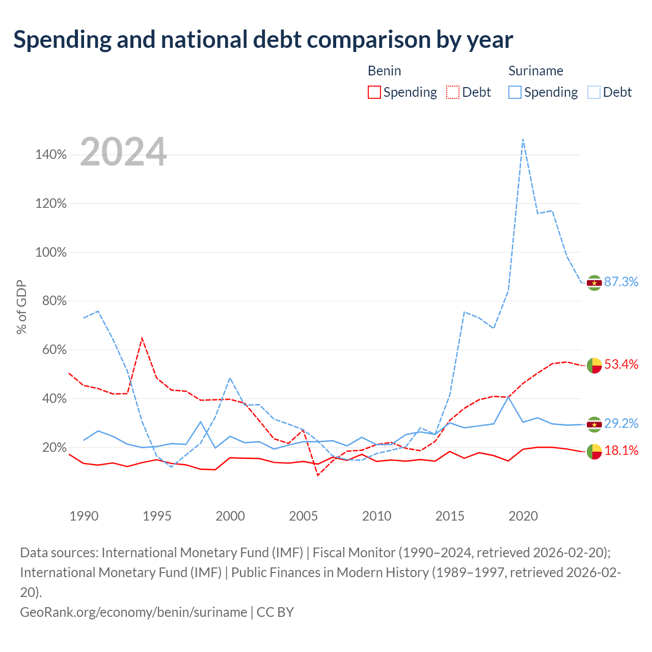 Benin has $11.5B in government debt (53.4% of GDP), compared to $3.86B (87.3% of GDP) in Suriname.