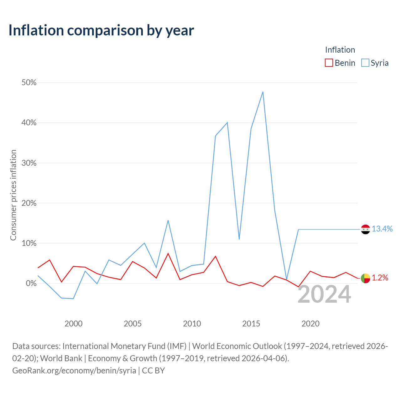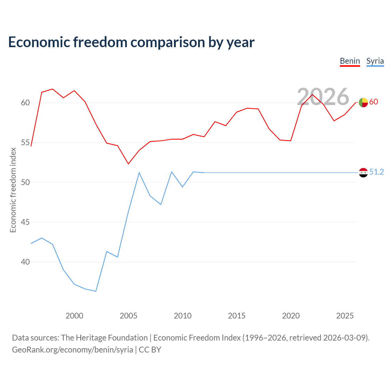 The Economic Freedom Index for Benin is 60, ranking 96/197, compared to 51.2 for Syria, ranking 155/197. The chart above displays a comparison of annual changes in economic freedom indexes.