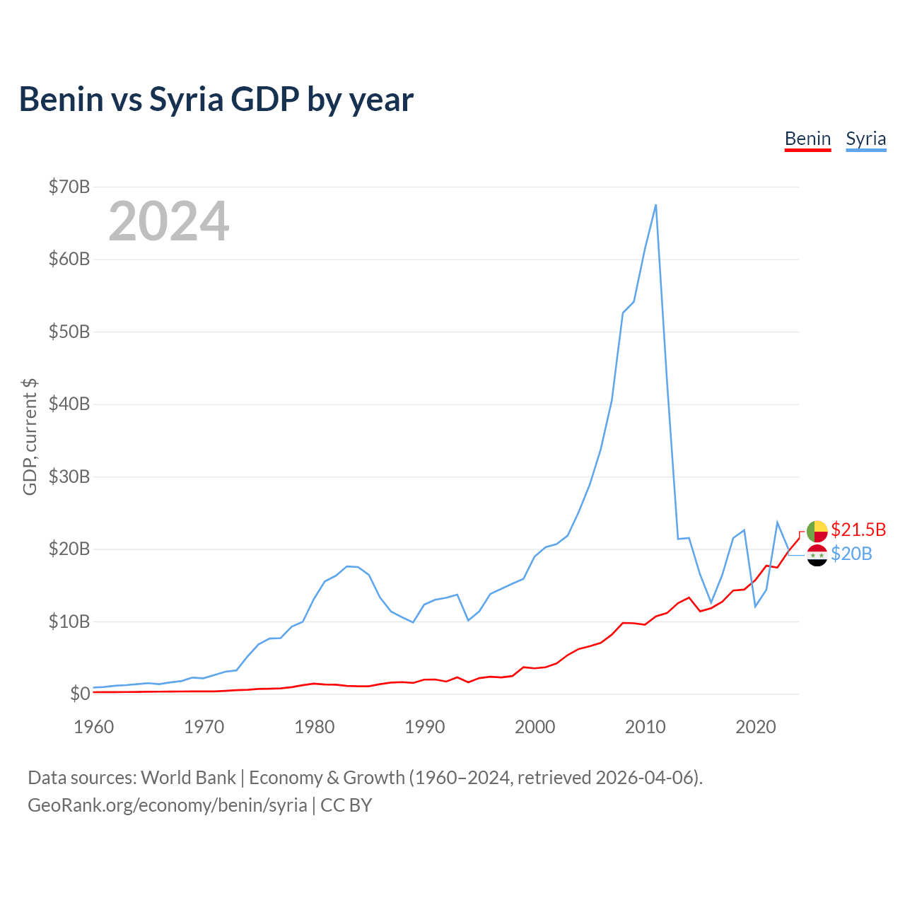 Benin has a GDP of $21.5B compared to $20B for Syria, ranking 126/197 and 129/197 by economy size, respectively.