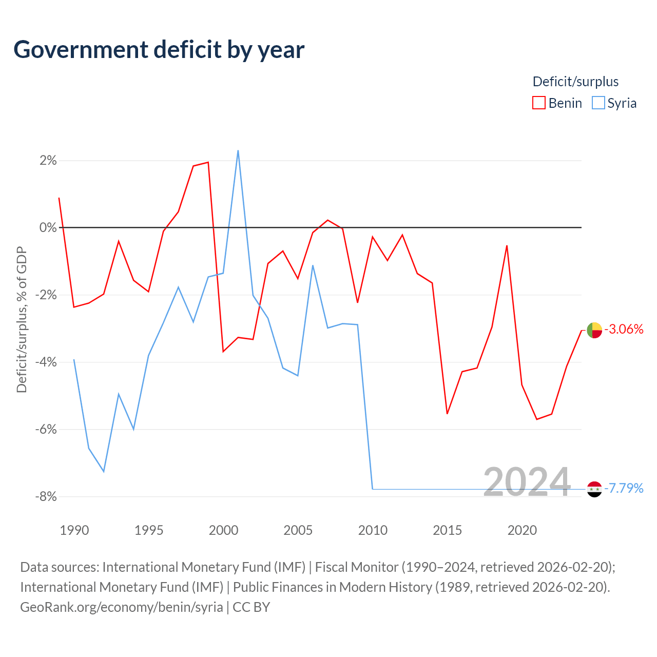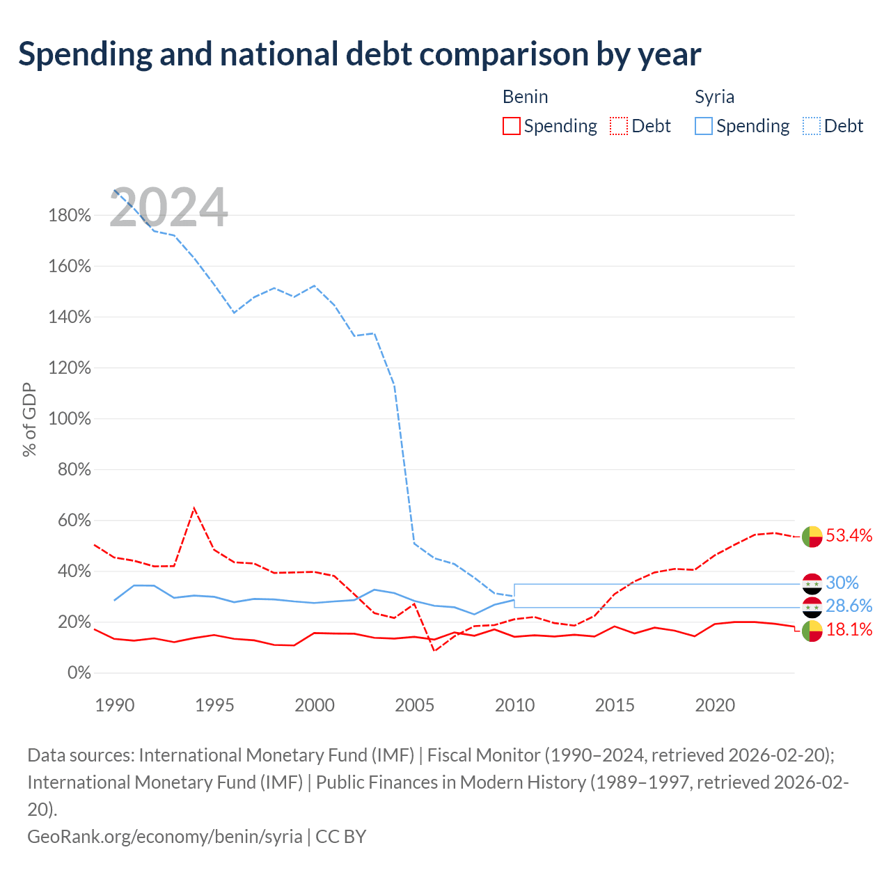 Benin has $11.5B in government debt (53.4% of GDP), compared to $18.4B (30% of GDP) in Syria.