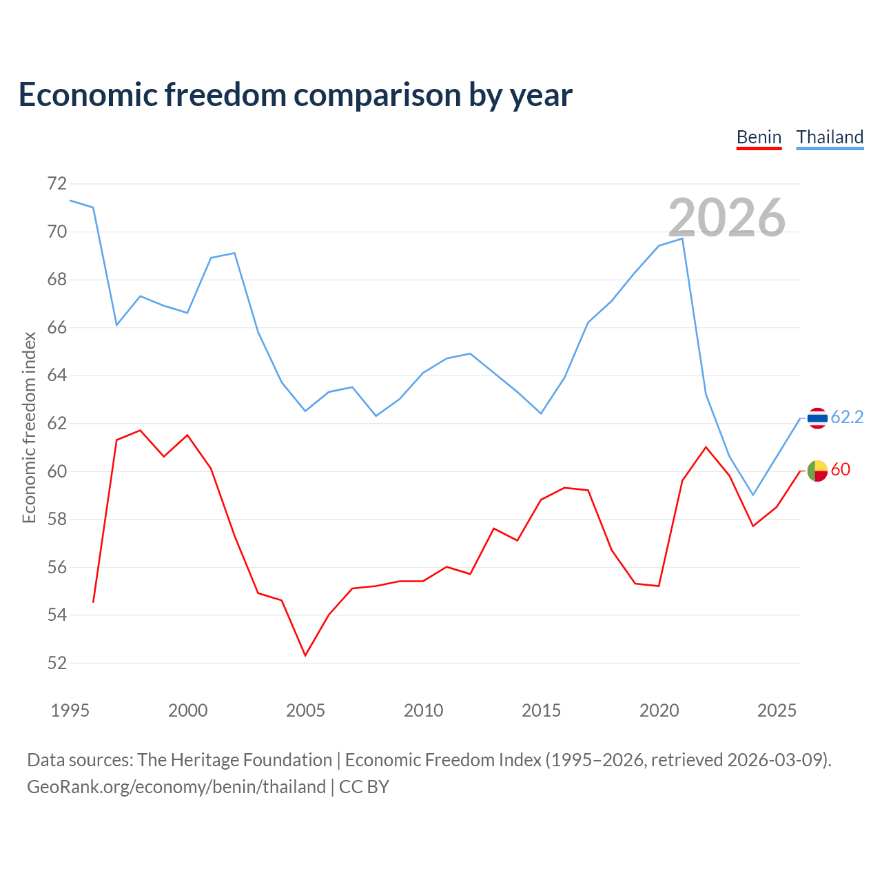 The Economic Freedom Index for Benin is 60, ranking 96/197, compared to 62.2 for Thailand, ranking 88/197. The chart above displays a comparison of annual changes in economic freedom indexes.