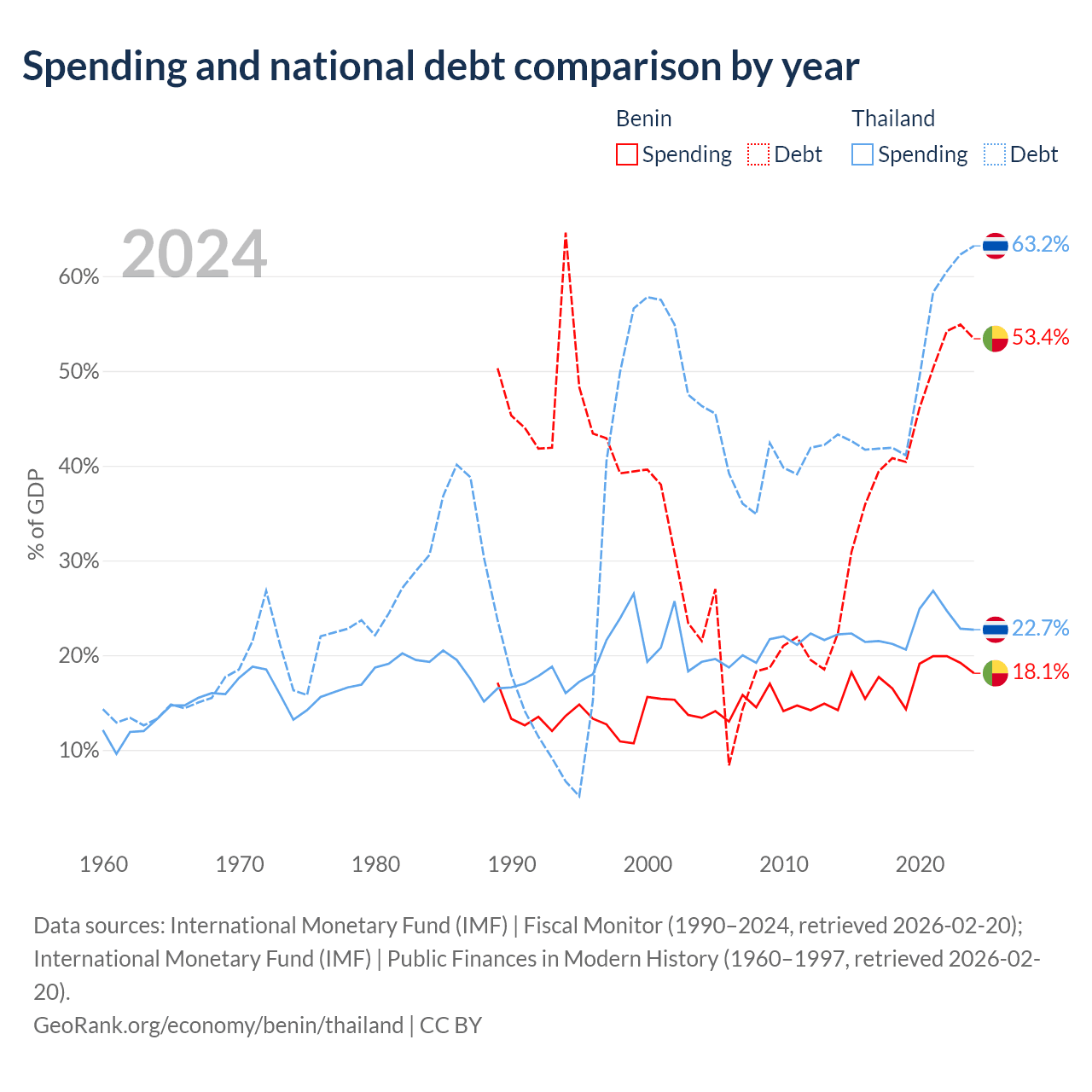 Benin has $11.5B in government debt (53.4% of GDP), compared to $333B (63.2% of GDP) in Thailand.