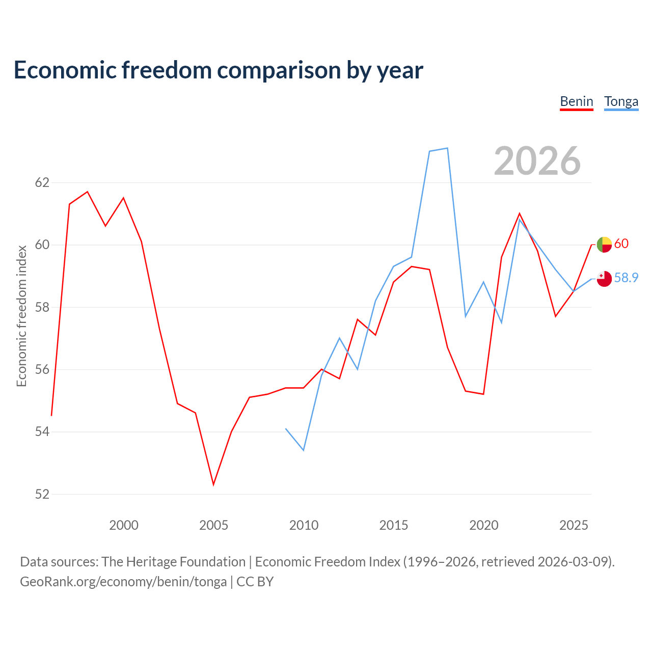 The Economic Freedom Index for Benin is 60, ranking 96/197, compared to 58.9 for Tonga, ranking 107/197. The chart above displays a comparison of annual changes in economic freedom indexes.