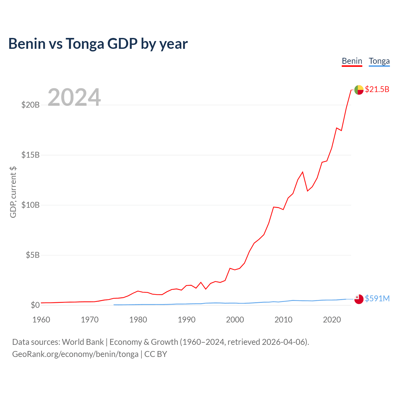 Benin has a GDP of $21.5B compared to $591M for Tonga, ranking 126/197 and 191/197 by economy size, respectively.